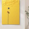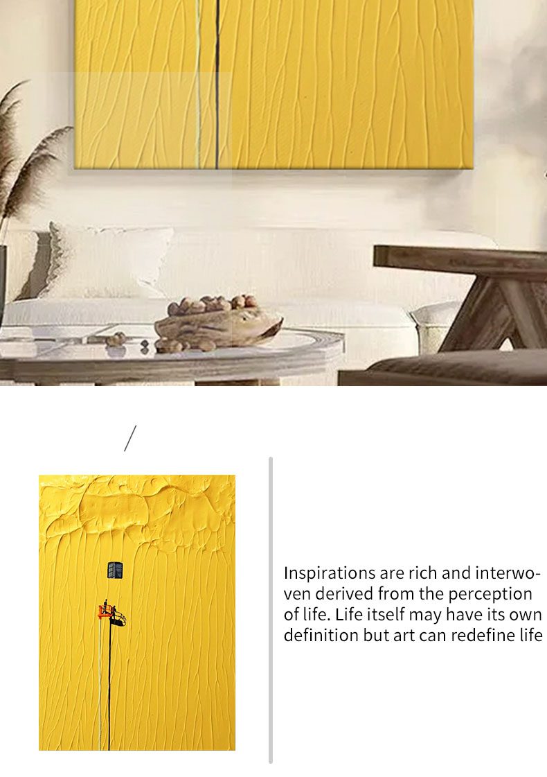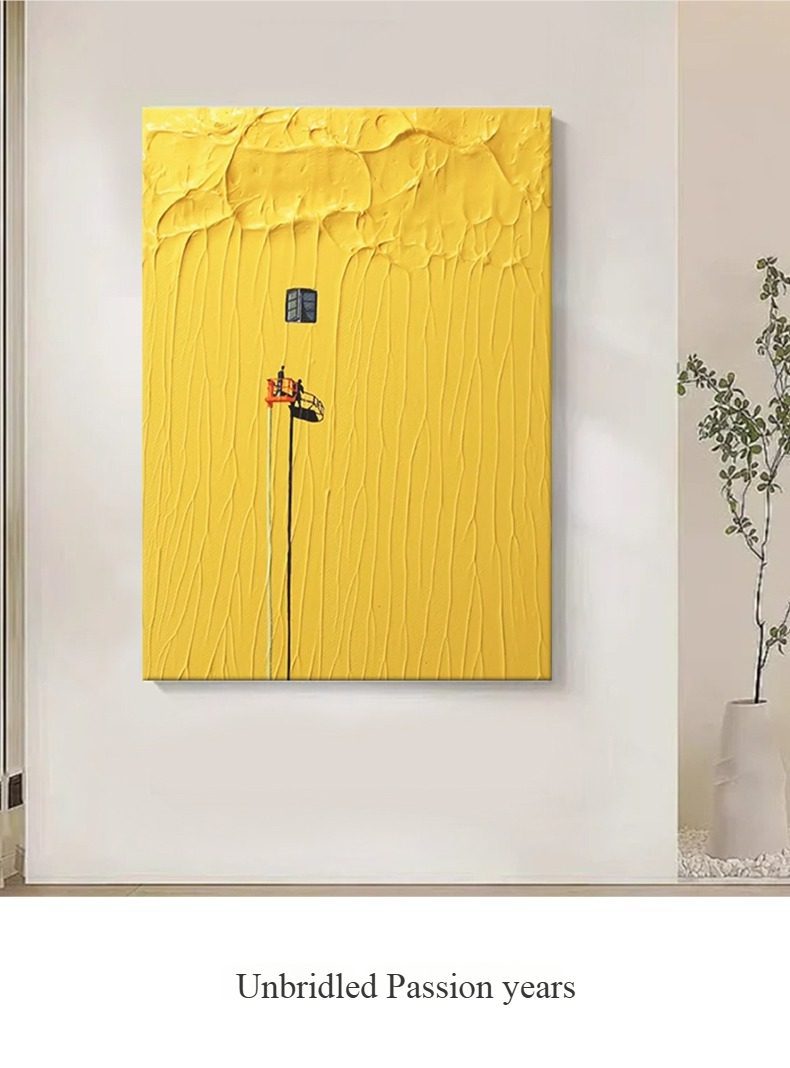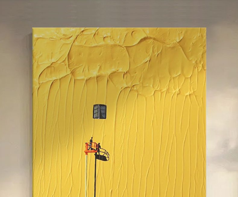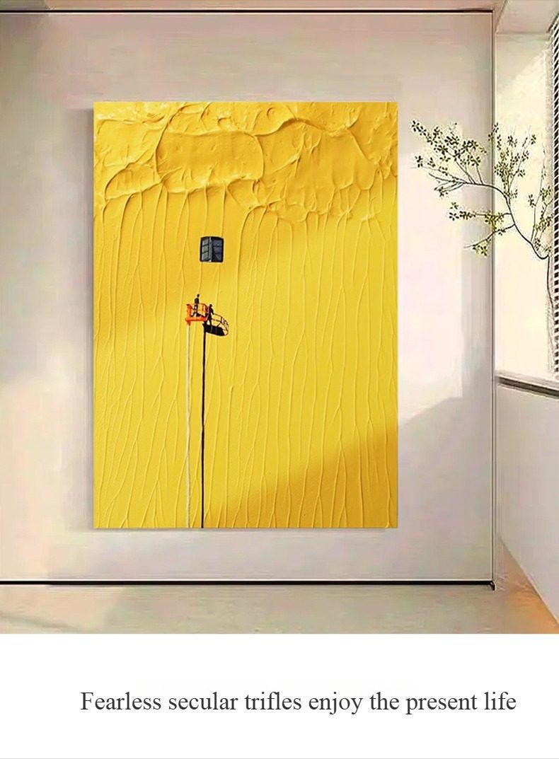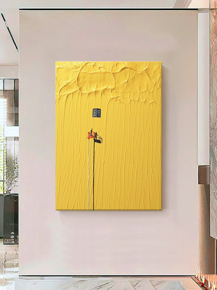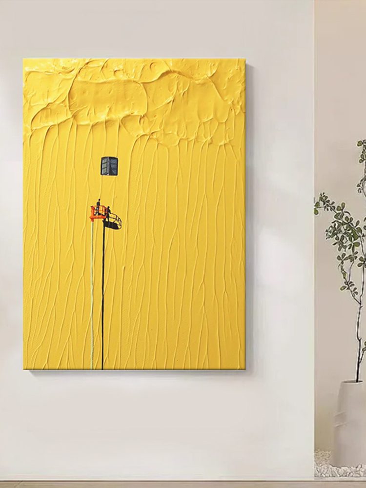 The painting features a bright yellow background that creates a warm and vibrant visual experience. In the center of the image, a black square object hangs down in mid-air, forming a stark contrast with the red basket below, creating a unique visual balance. The figure inside the basket is engaged in high-altitude work, with an animated posture that adds dynamism to the scene.