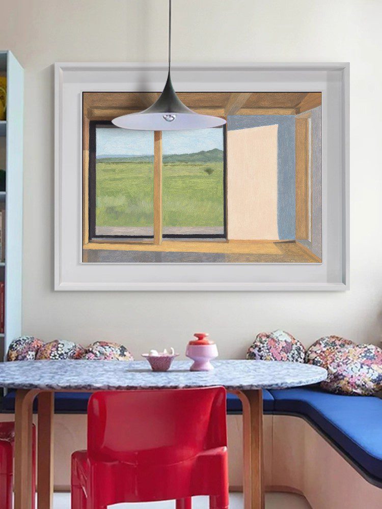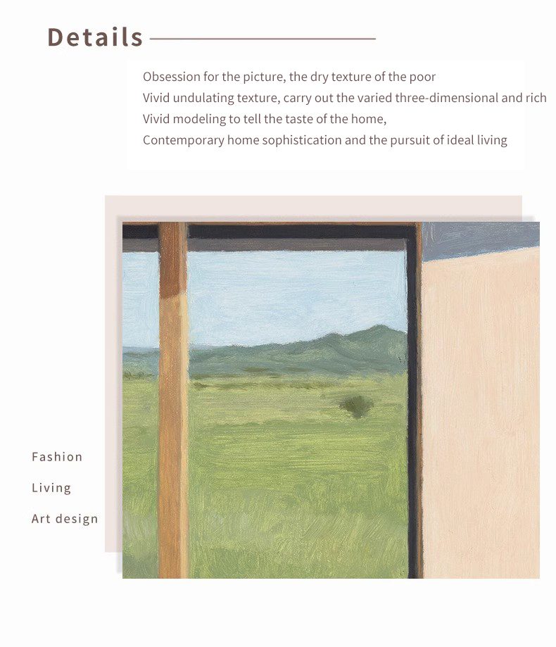 The painting depicts a serene and distant pastoral scene. A half-open window gently introduces the greenery and blue sky outside. Outside the window, there are boundless green fields that meet the azure sky, with colors that are soft and harmonious, providing a refreshing and uplifting feeling to the viewer. Painting core material: canvas Craftsmanship: pure hand-painted Applicable space: living room, bedroom,dining room,vestibule Pigments: Windsor Newton imported paints Size:60*40cm|80*60cm|100*70cm