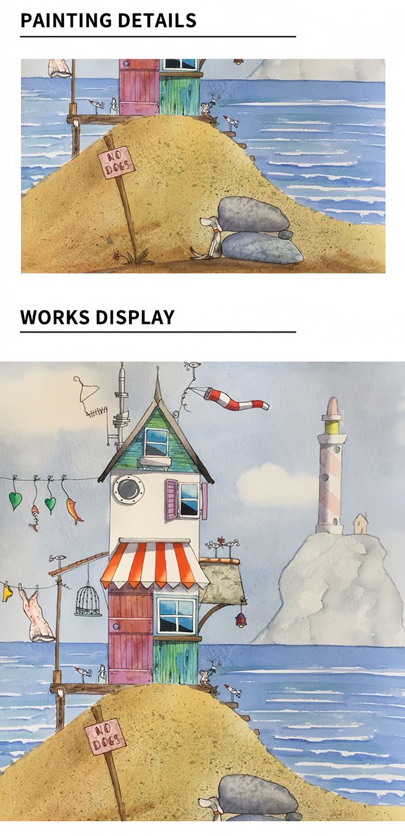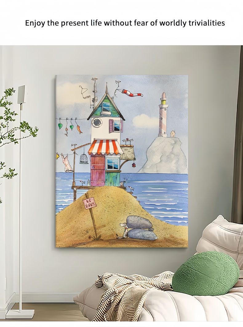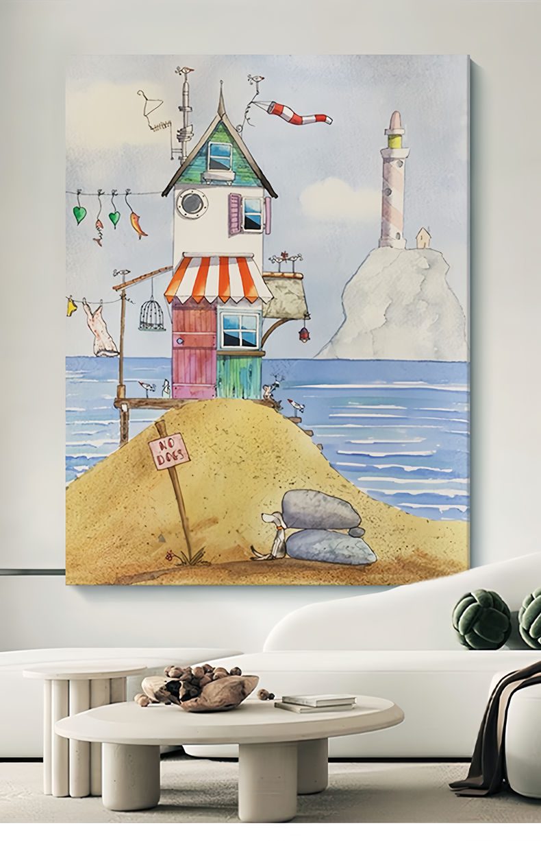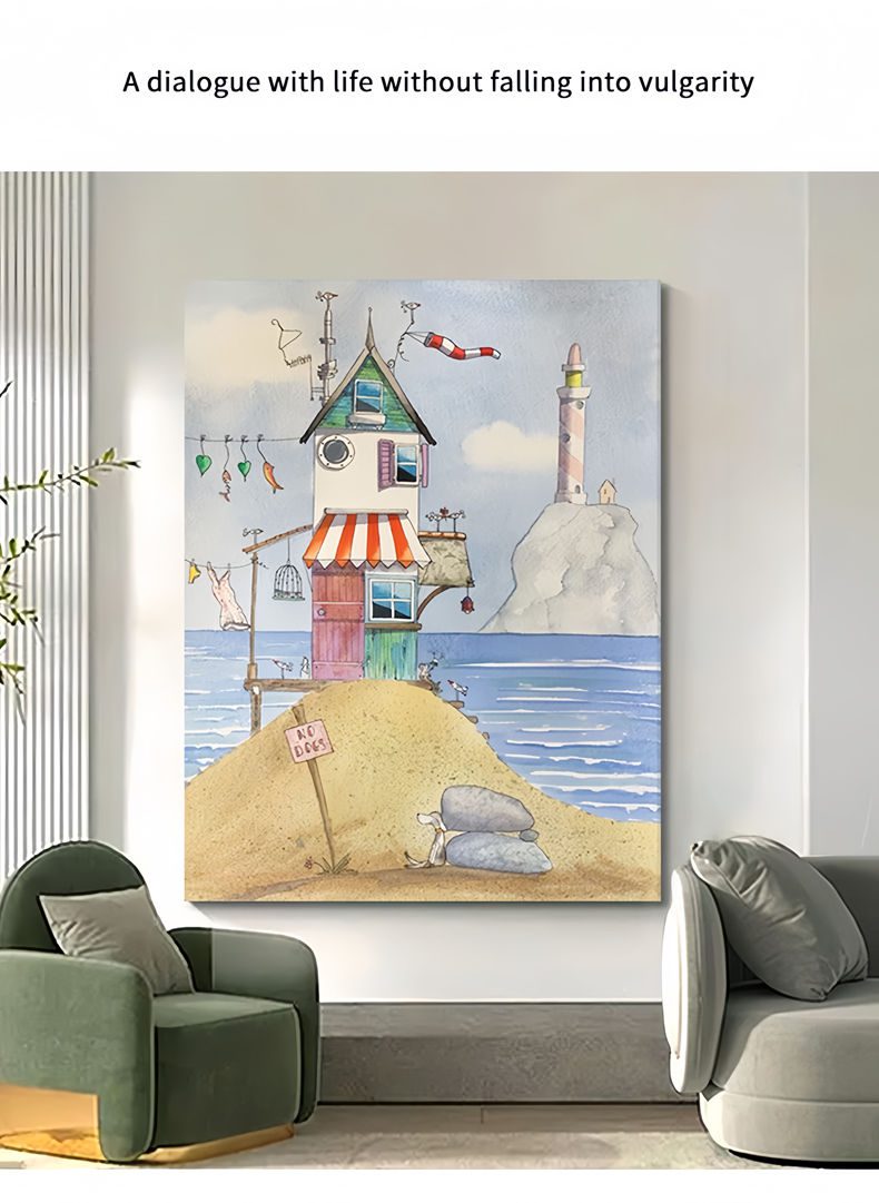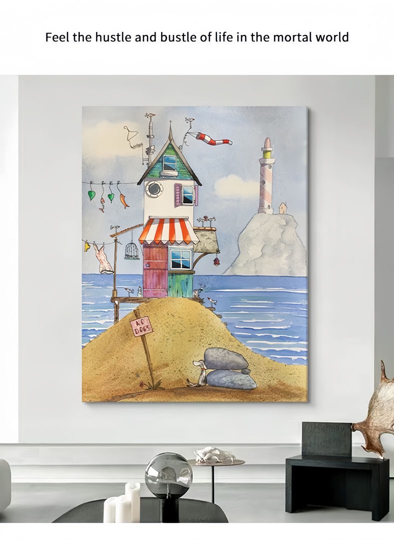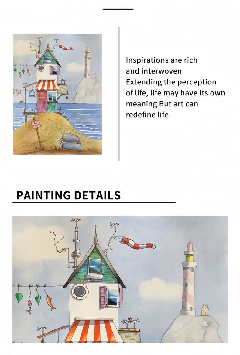 The house in the picture stands on the seaside, shrouded by fantastic light and shadow, adding a sense of mystery and romance. The waves gently hit the shore, forming a sharp contrast with the house, creating an atmosphere beyond reality. The design of the house itself is also quite distinctive, integrating a variety of elements, making people feel as if they are in a dream world.