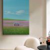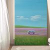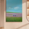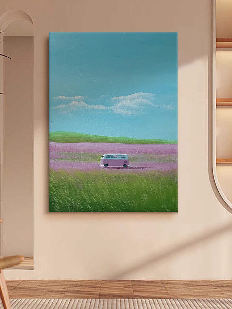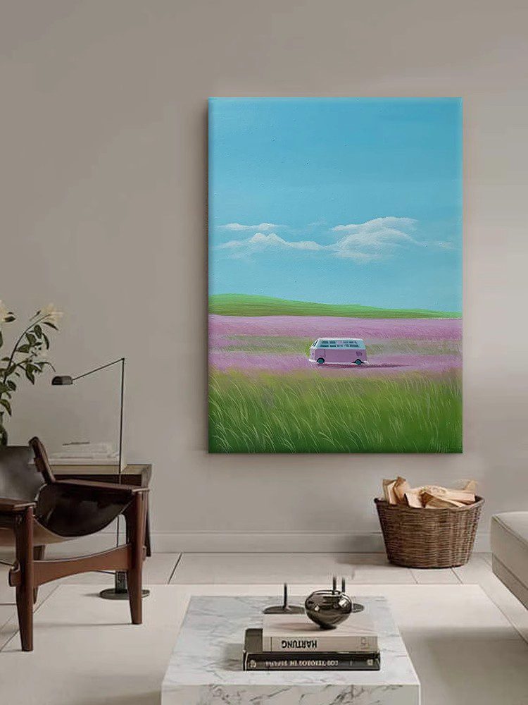 The painting depicts a pink van leisurely driving through a sea of vibrant lavender flowers. Against the backdrop of blue sky and white clouds, green hills stretch endlessly, creating a picturesque scene. The van seems to become the lively note in this natural canvas, telling a story of freedom and exploration. The colors in the painting are bright and exude tranquility and comfort, making one feel as if they can smell the fragrance of lavender and embrace the gentle embrace of nature. Each stroke reveals a love and longing for life, inspiring endless imagination.