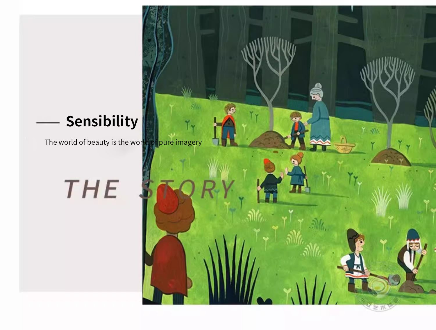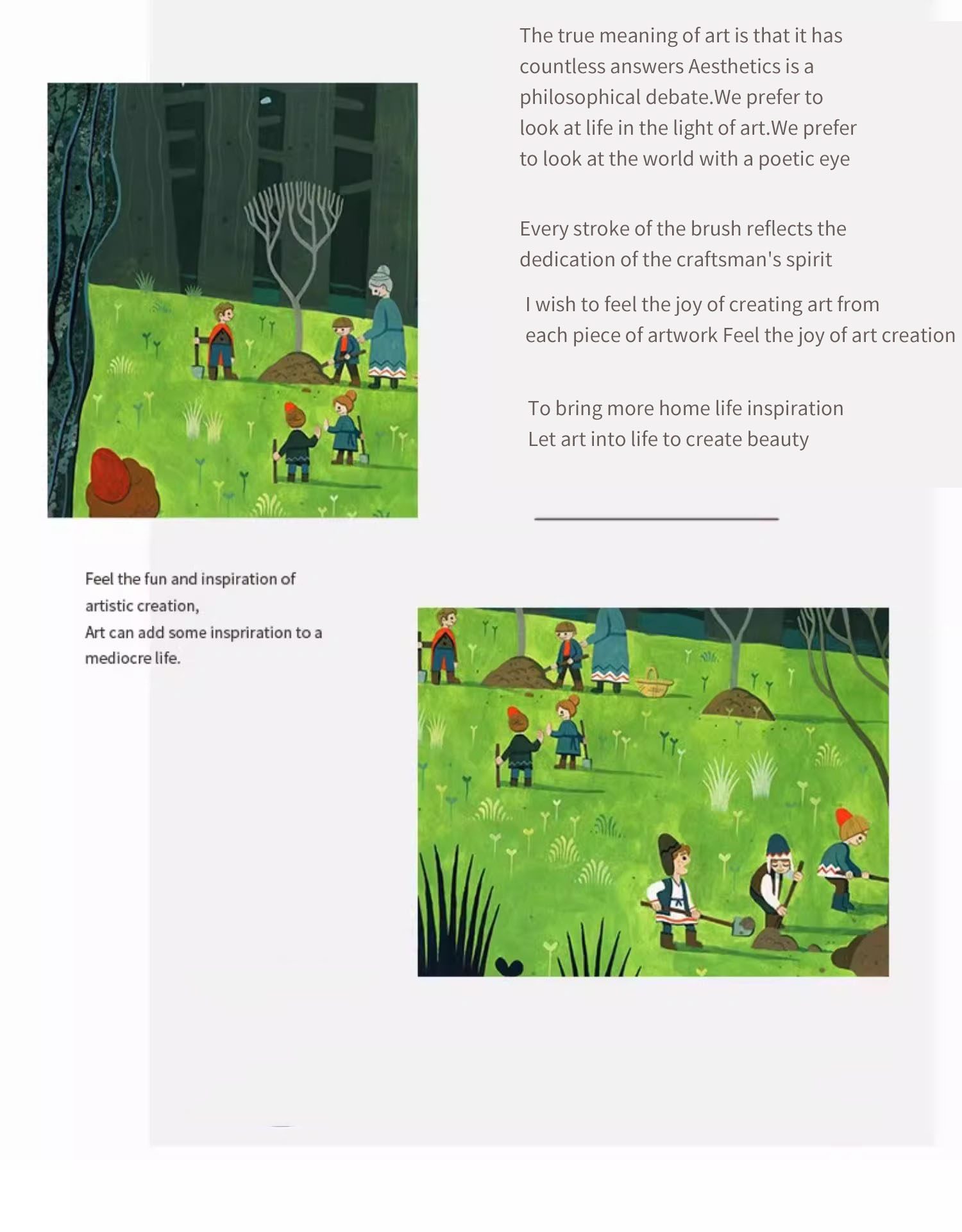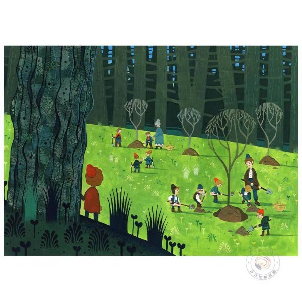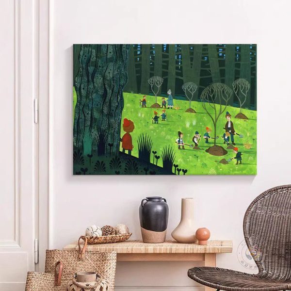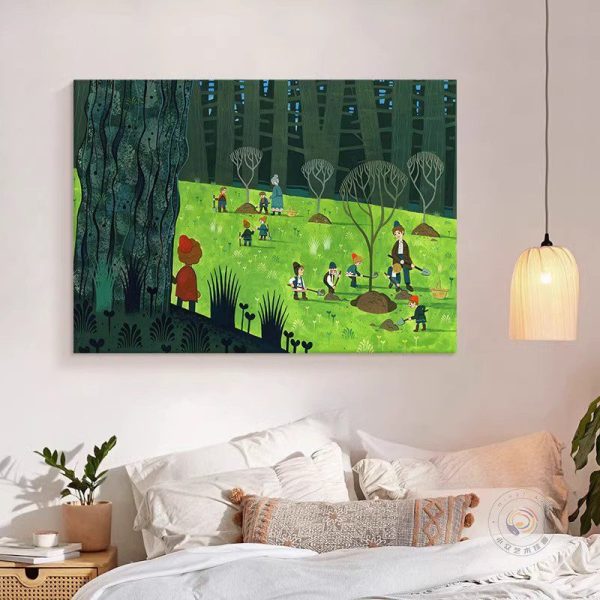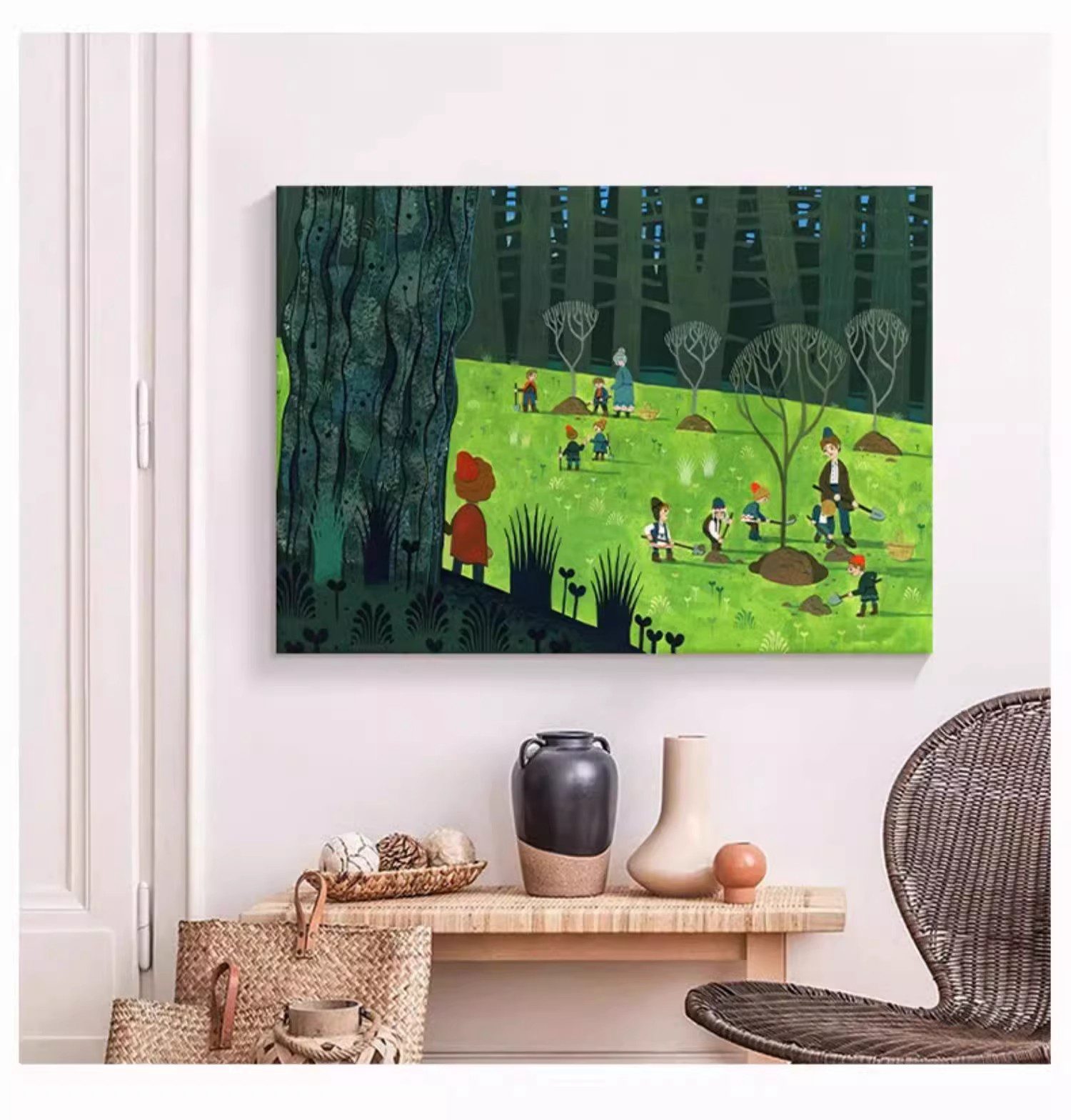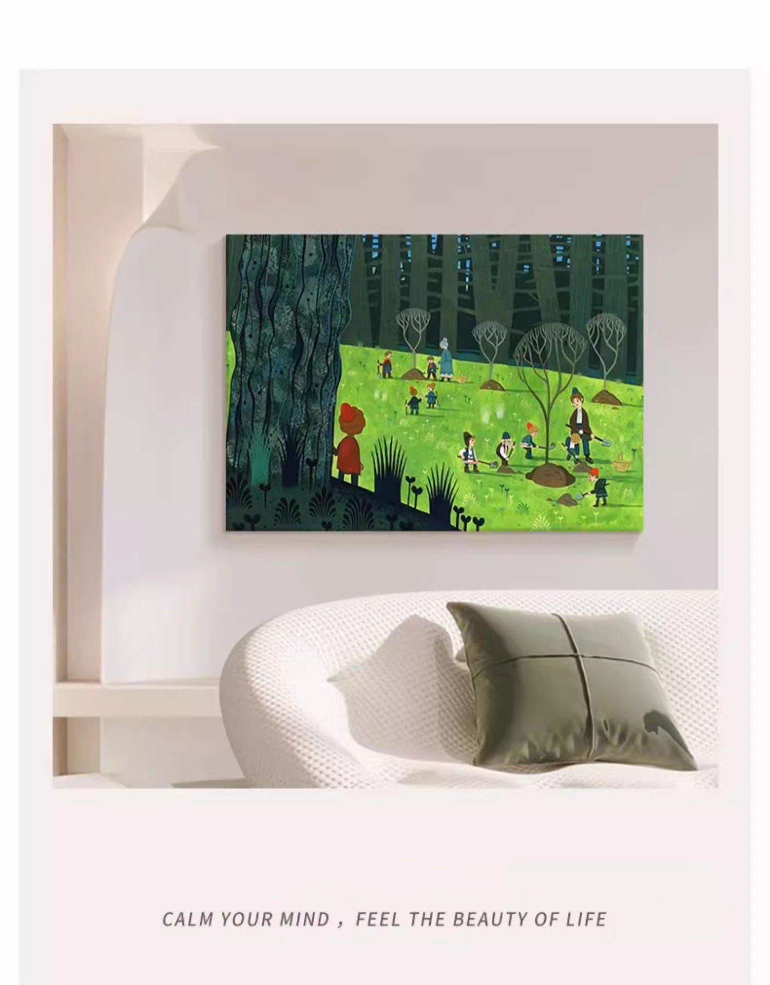 The painting depicts a beautiful scene of harmony between humans and nature. On the left side of the picture, dense forests are lush and verdant, resembling a natural green barrier. On the right side, an open grassland is filled with people enthusiastically planting trees; some are sweating profusely digging holes, others carefully straightening up saplings, and still others diligently watering them. Everyone is fully engaged, adding new vitality to the forest. The colors in the painting are vibrant and full of energy, not only showcasing the hard work and beauty of labor but also conveying the profound meaning of coexistence and mutual protection of human and nature, as well as jointly safeguarding our green homeland.