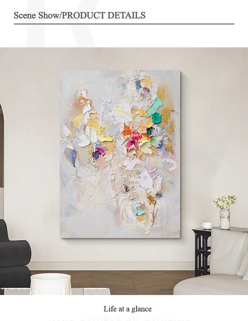 This painting is an abstract work of art full of dreamy colors. The picture is dominated by soft white, yellow and pink, dotted with green, orange and blue, creating a warm and mysterious atmosphere. The heavy brushstrokes and accumulation of paint give the painting a three-dimensional and layered feeling. It has no clear image or theme, but leaves unlimited imagination for the viewer. Everyone can find resonance in the painting and feel an indescribable flow of emotions.