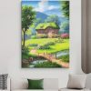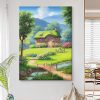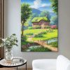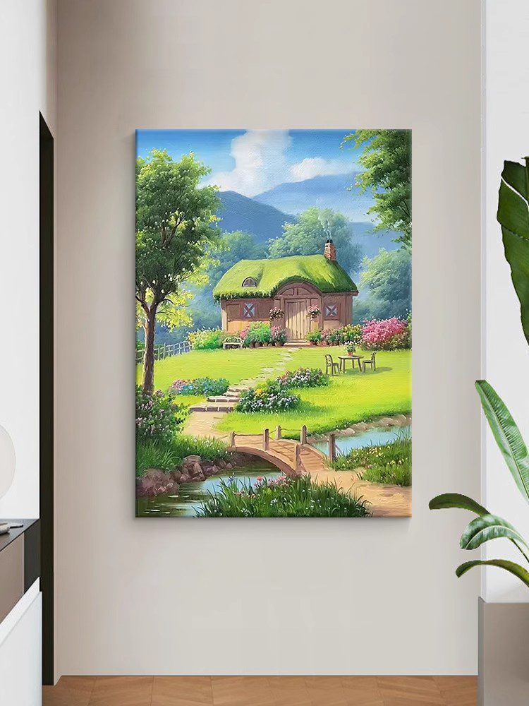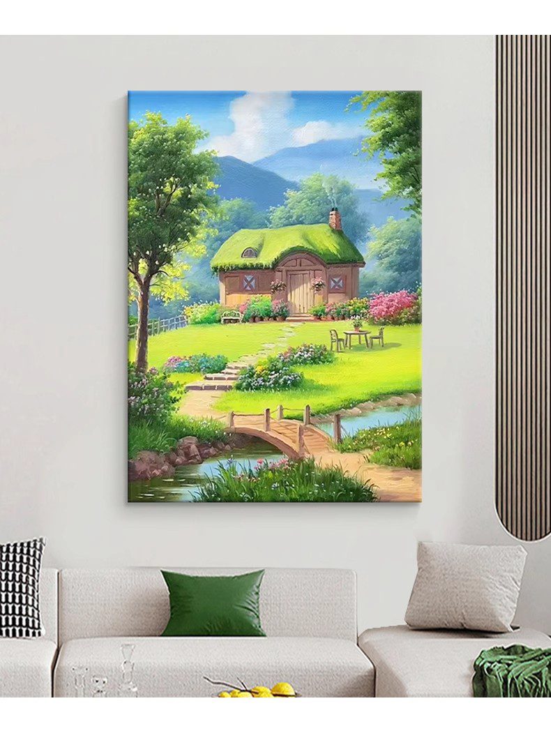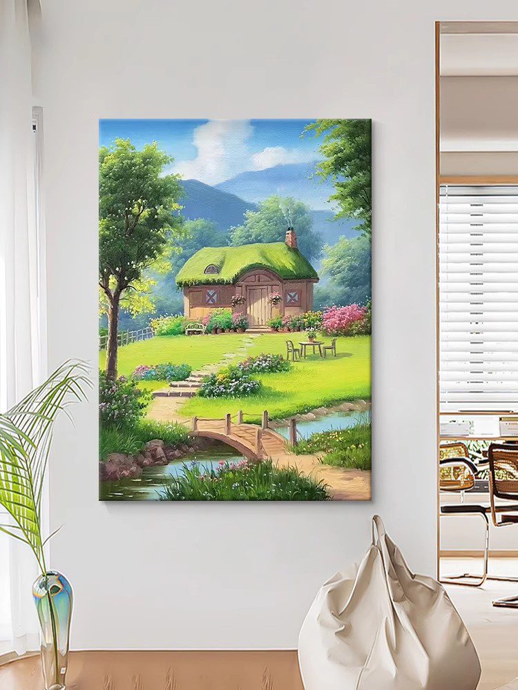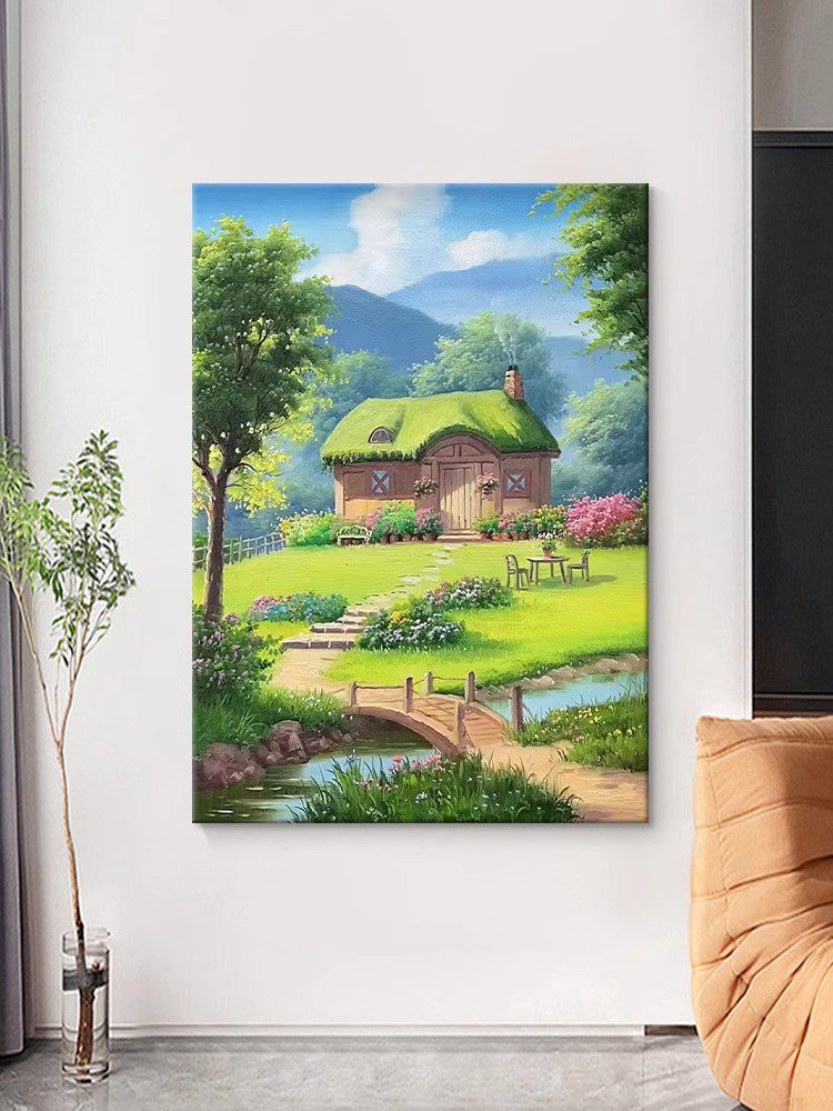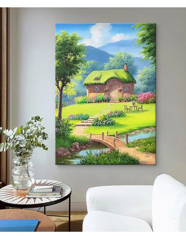 This Hayao Miyazaki-style oil painting depicts a dreamlike pastoral scene: a small thatched-roof cottage stands quietly, gently embraced by lush flowers and trees. In front of the cottage, a path winds to a small wooden bridge, and under the bridge, the stream gurgles and is clear to the bottom. In the distance, the towering green mountains complement the blue sky and white clouds, creating a beautiful scene.