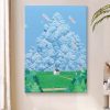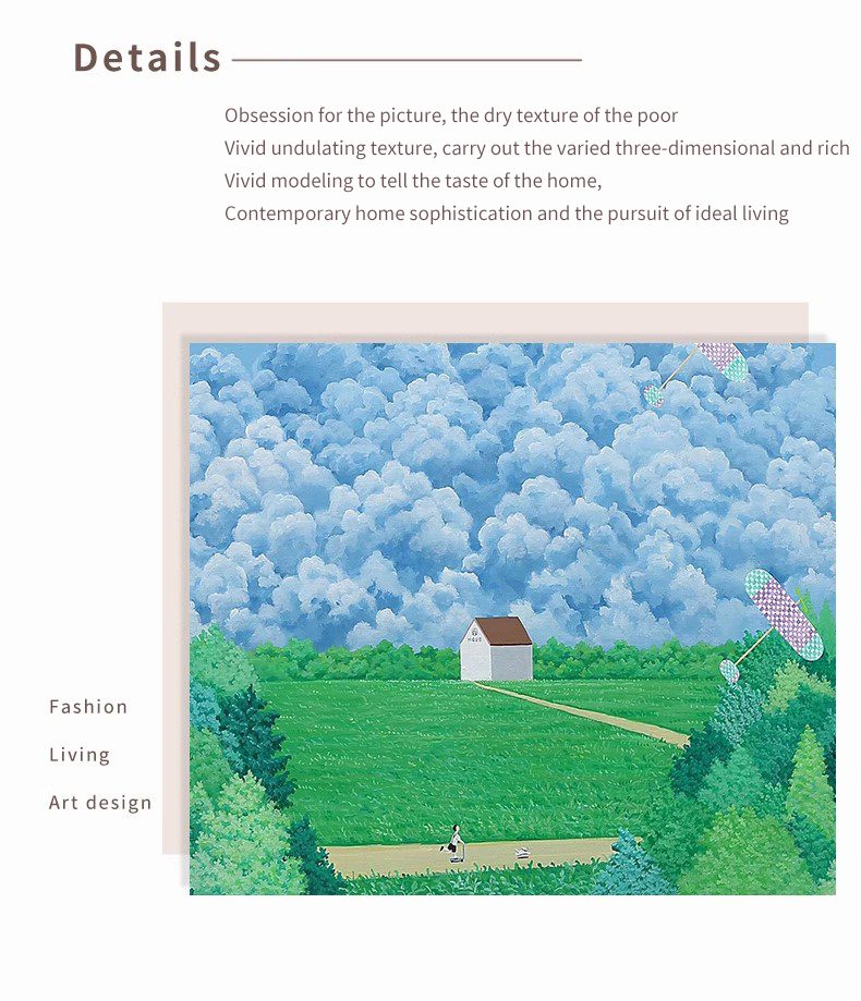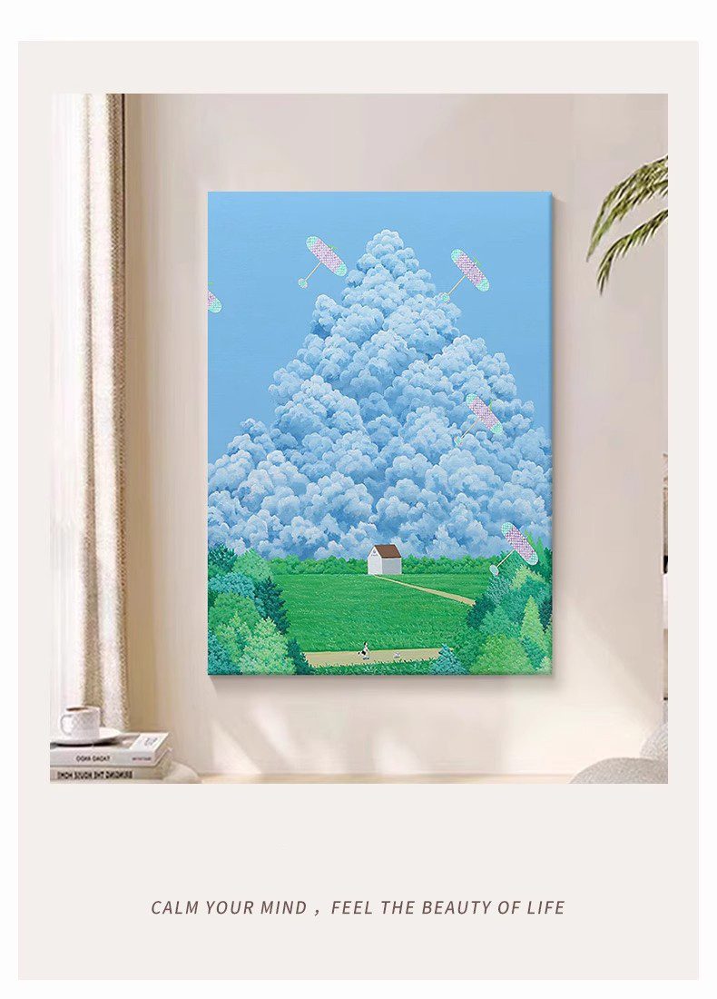 The painting depicts a serene and peaceful rural scene: the blue sky and white clouds float leisurely, lush grass covers the earth, and a winding path leads to a cozy white cottage. In the picture, several colorful umbrellas drift gently in the air, playfully frolicking among the clouds like children, adding a touch of whimsy and childlike joy to the tranquil image. The overall color scheme is fresh and bright, creating an atmosphere that is calm, distant, comfortable, and pleasant. The painting makes one feel as if they are in a utopia, with their mind greatly relaxed and delighted. Painting core material: canvas Craftsmanship: pure hand-painted Applicable space: living room, bedroom,dining room,vestibule Pigments: Windsor Newton imported paints Size:40*65cm|60*85cm|70*100cm