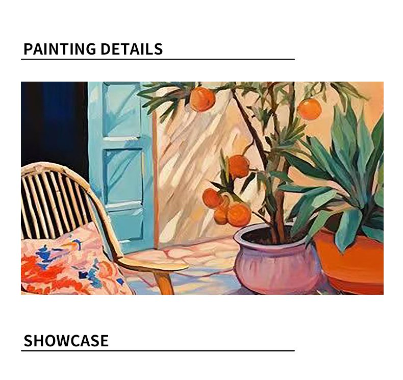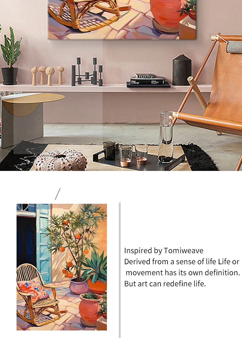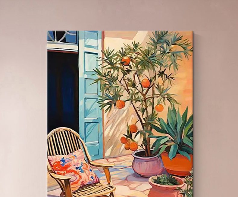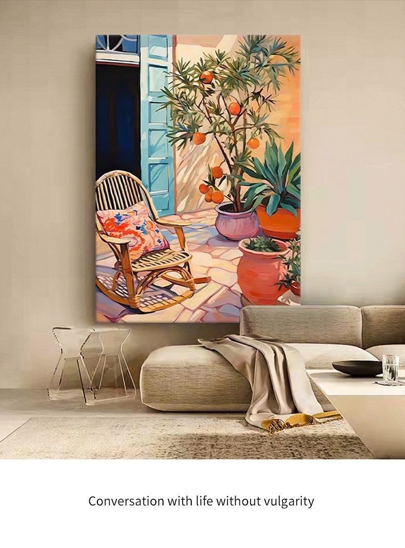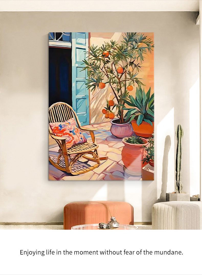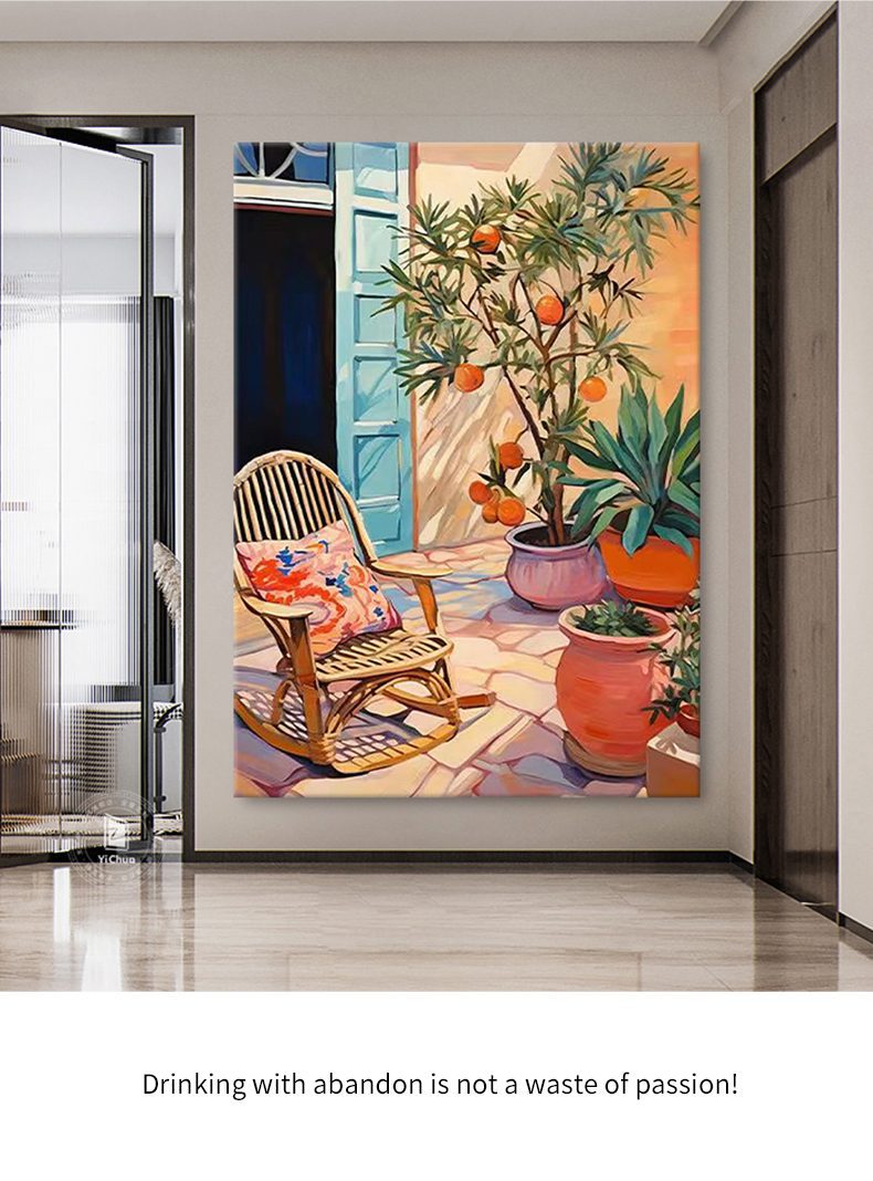 A wicker rocking chair is placed in the center, adorned with brightly colored cushions that add a touch of comfort and coziness. Next to the rocking chair, an orange tree laden with fruit stands proudly, while several pots of green plants beneath it are thriving, bringing a refreshing note to the courtyard.