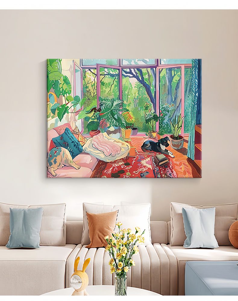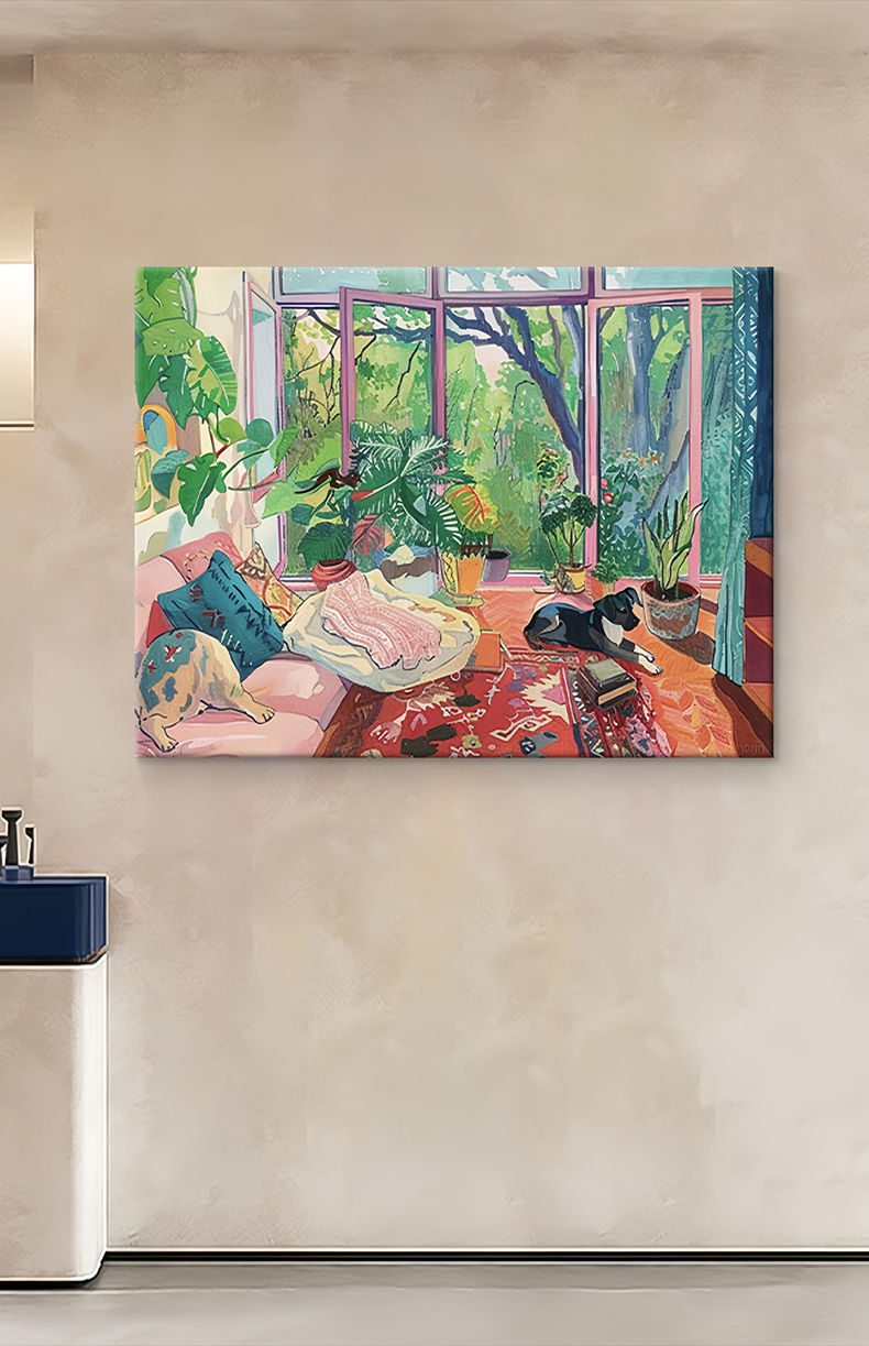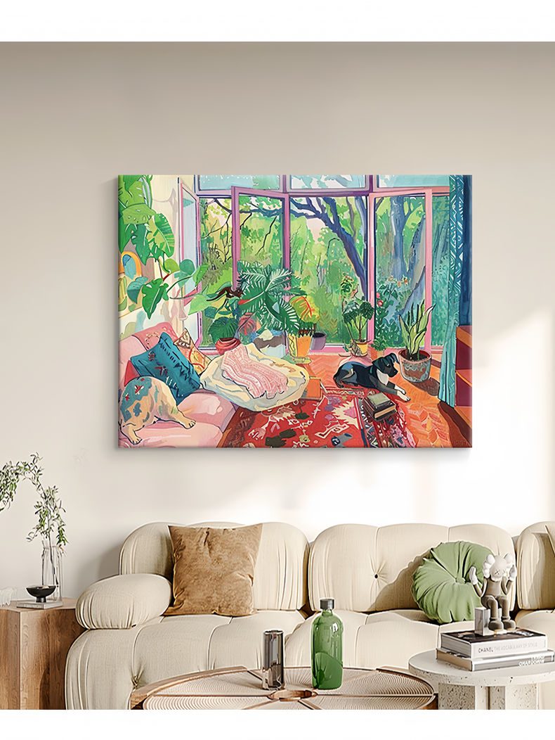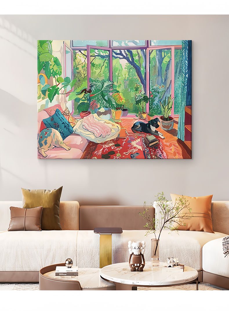 Through the large windows, greenery is everywhere, bringing natural vitality to the interior. On the windowsill, various plants are scattered in an orderly manner, adding vitality to the space. On the soft sofa, several cushions are scattered among them, and two pets, a cat and a dog, are lying lazily, enjoying the tranquility. On the colorful carpet, a little bear doll is quietly waiting, as if telling the joy of childhood.