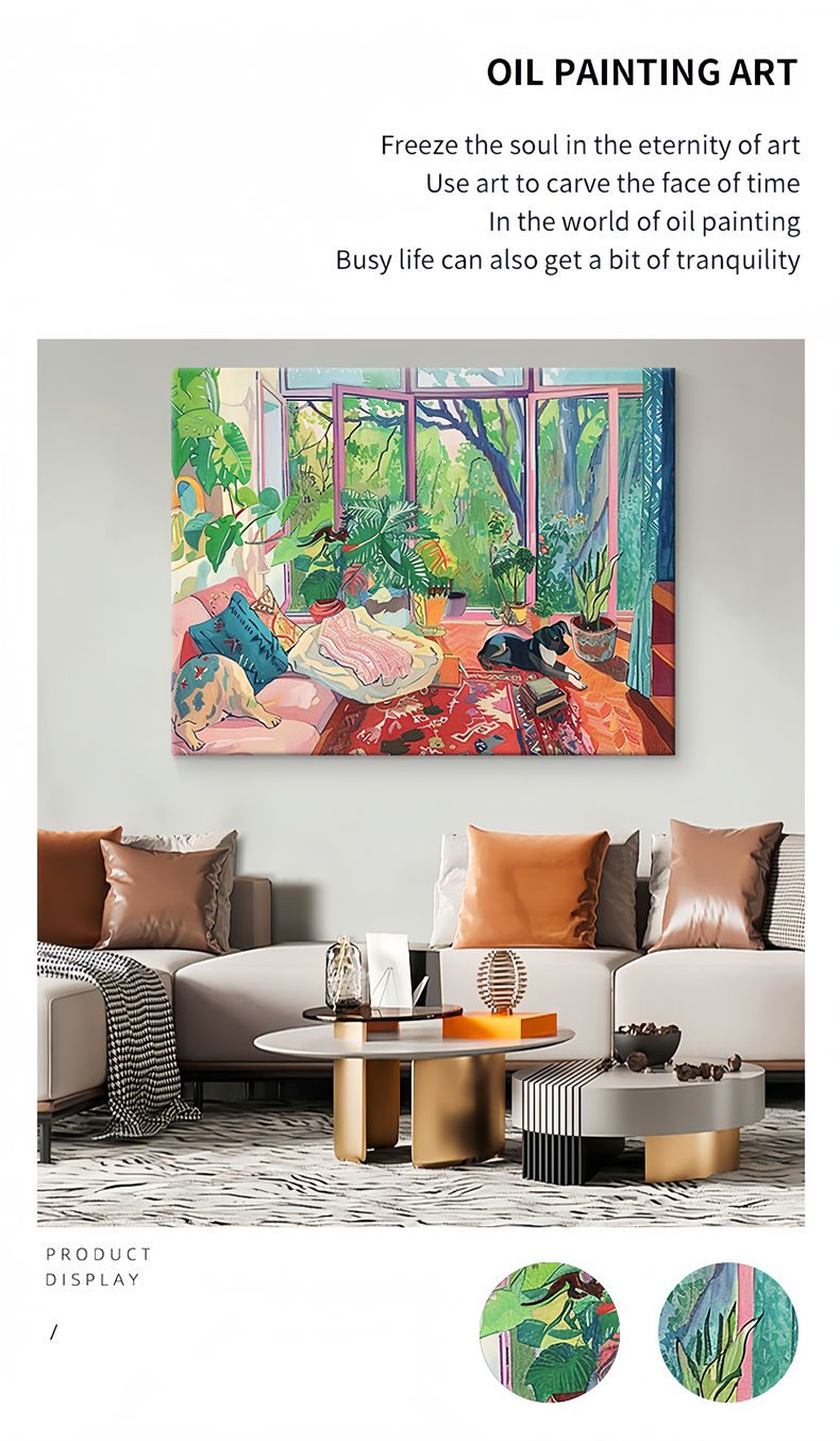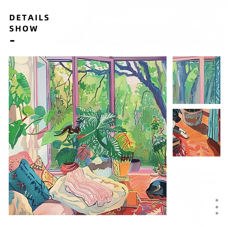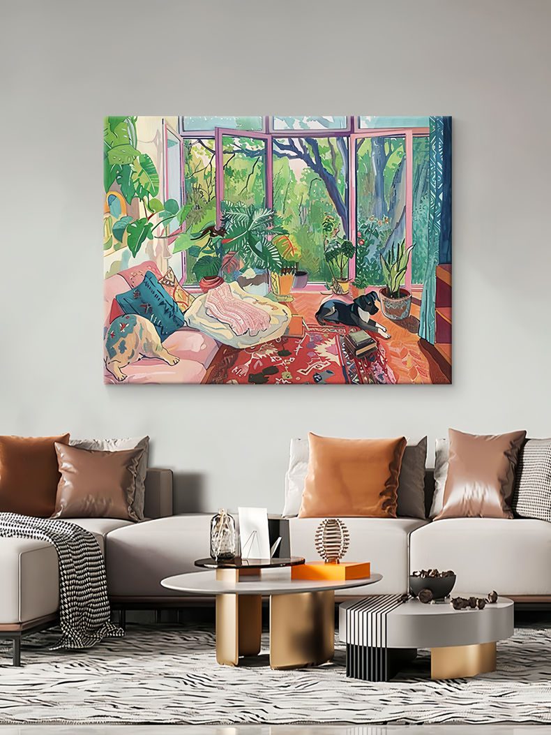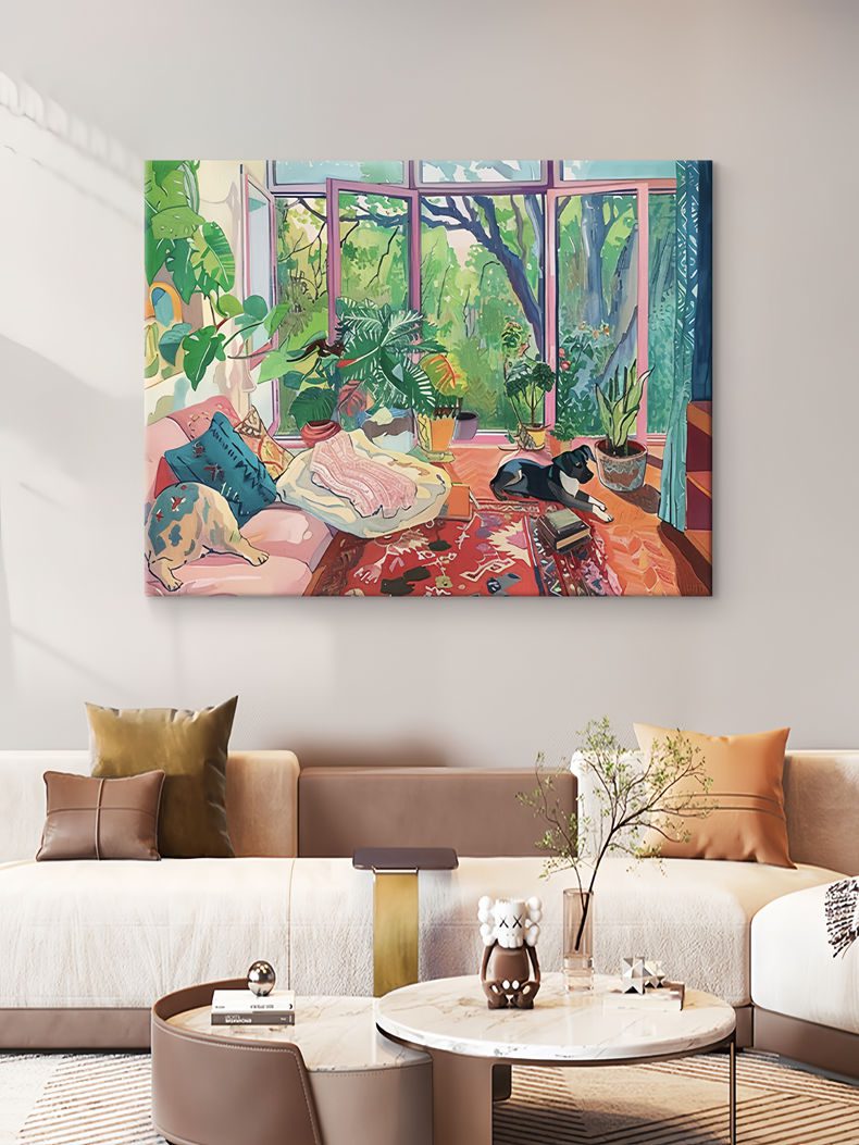 Through the large windows, greenery is everywhere, bringing natural vitality to the interior. On the windowsill, various plants are scattered in an orderly manner, adding vitality to the space. On the soft sofa, several cushions are scattered among them, and two pets, a cat and a dog, are lying lazily, enjoying the tranquility. On the colorful carpet, a little bear doll is quietly waiting, as if telling the joy of childhood.