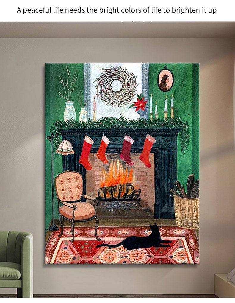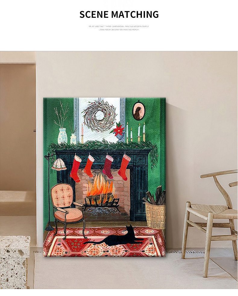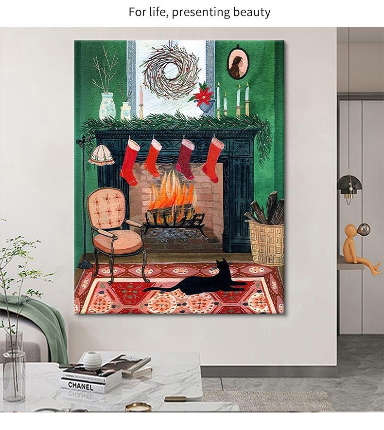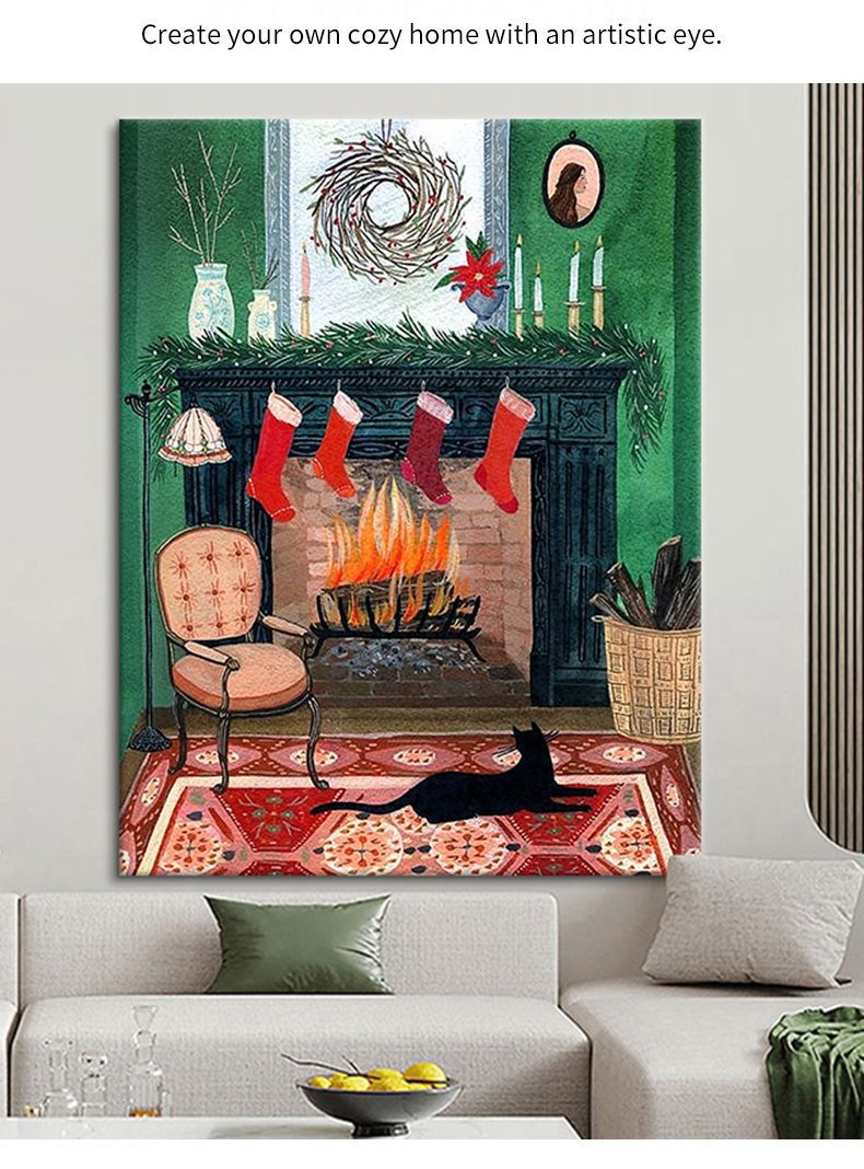 The painting depicts a cozy Christmas night scene. The fireplace is adorned with green garlands and lit candles, creating a strong festive atmosphere. Three red stockings hang in front of the fireplace, eagerly awaiting Santa’s surprises. The flames crackle, bringing warmth and light to the room.