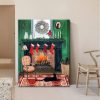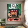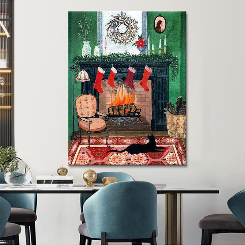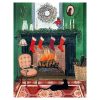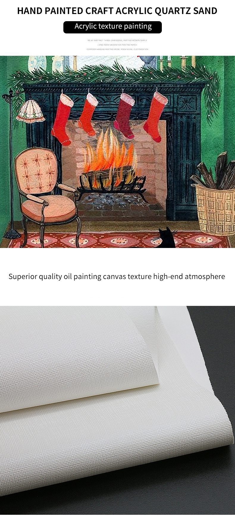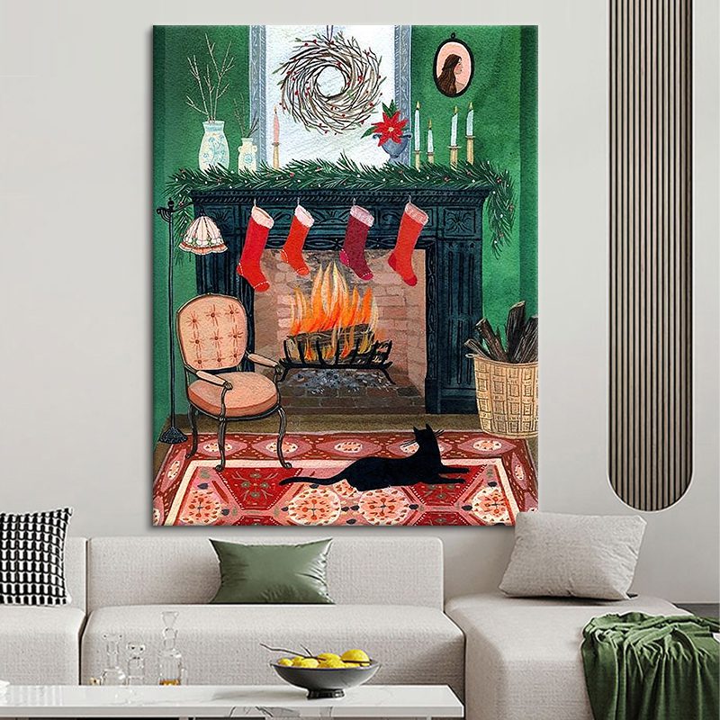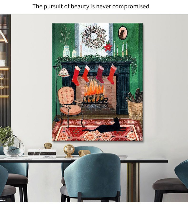 The painting depicts a cozy Christmas night scene. The fireplace is adorned with green garlands and lit candles, creating a strong festive atmosphere. Three red stockings hang in front of the fireplace, eagerly awaiting Santa’s surprises. The flames crackle, bringing warmth and light to the room.