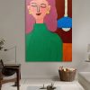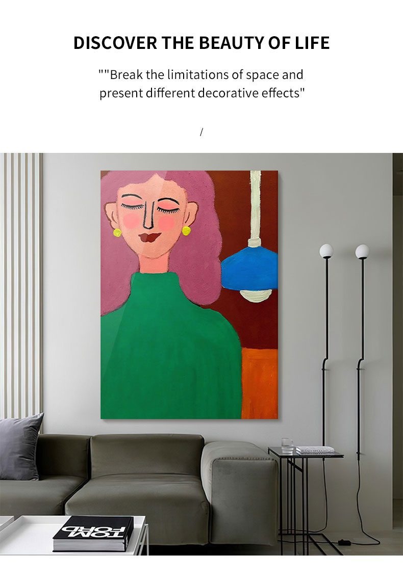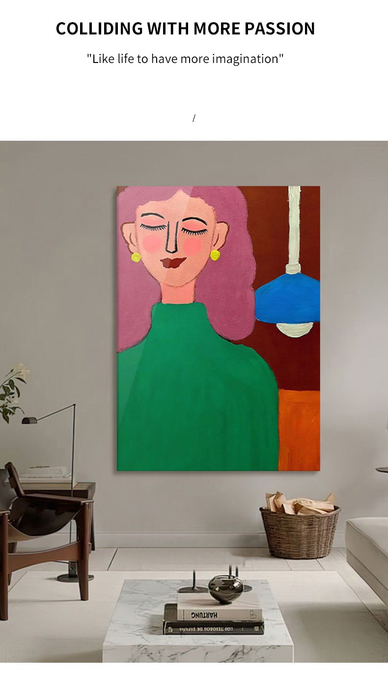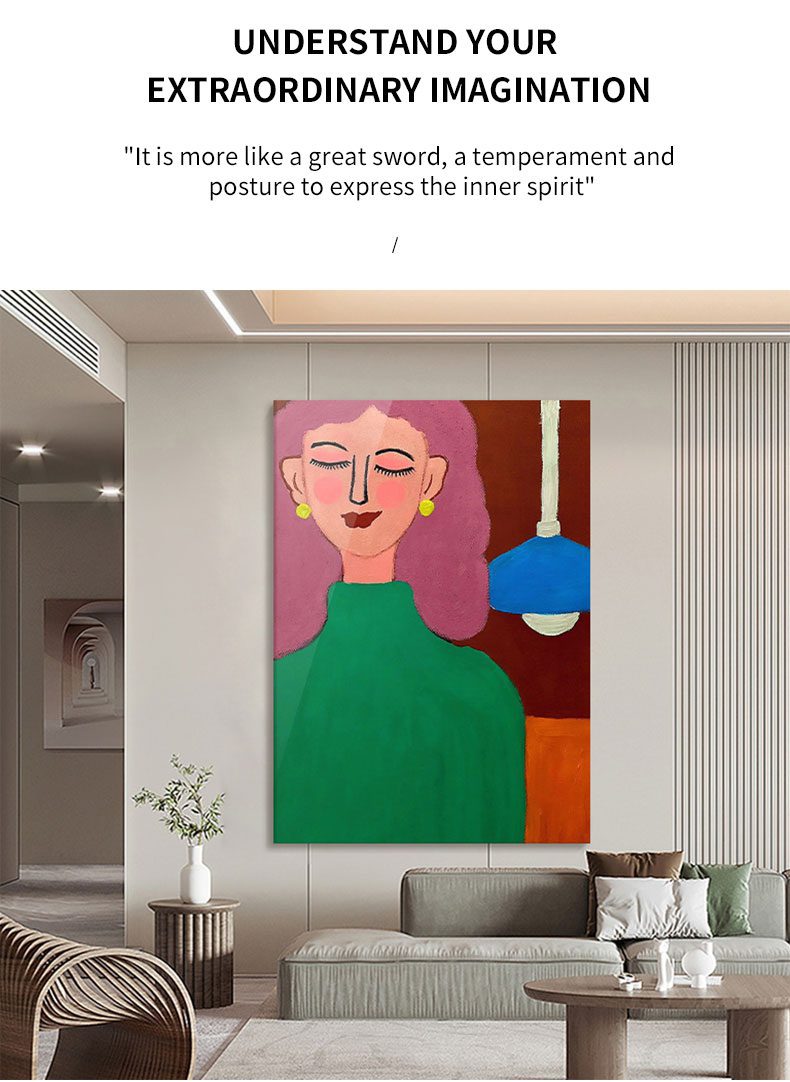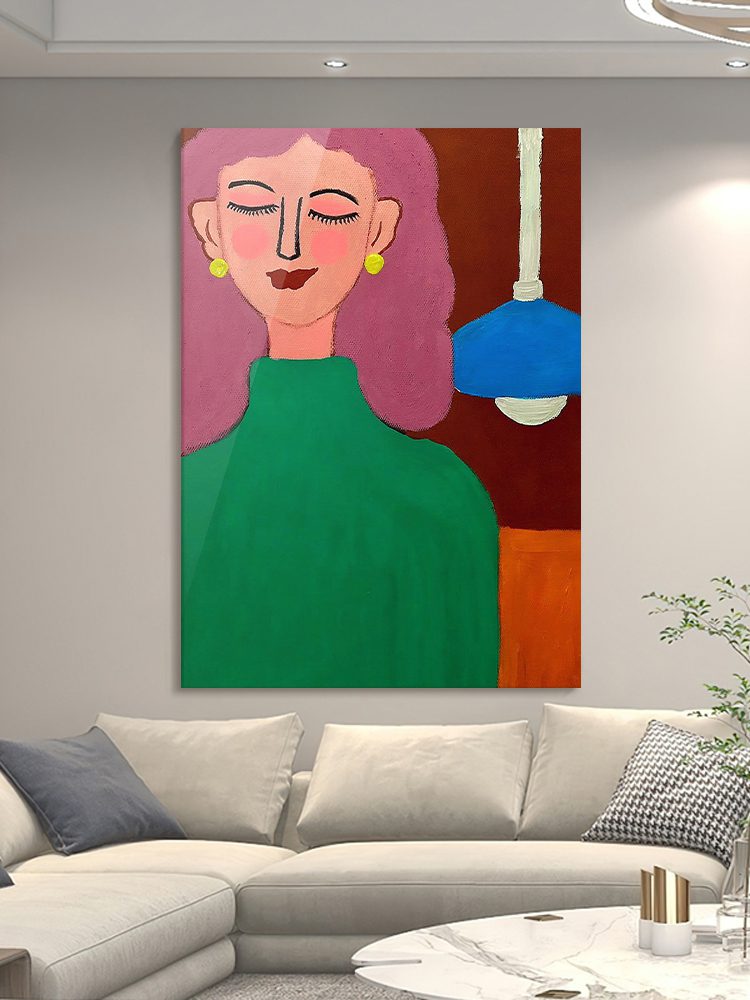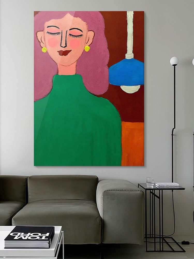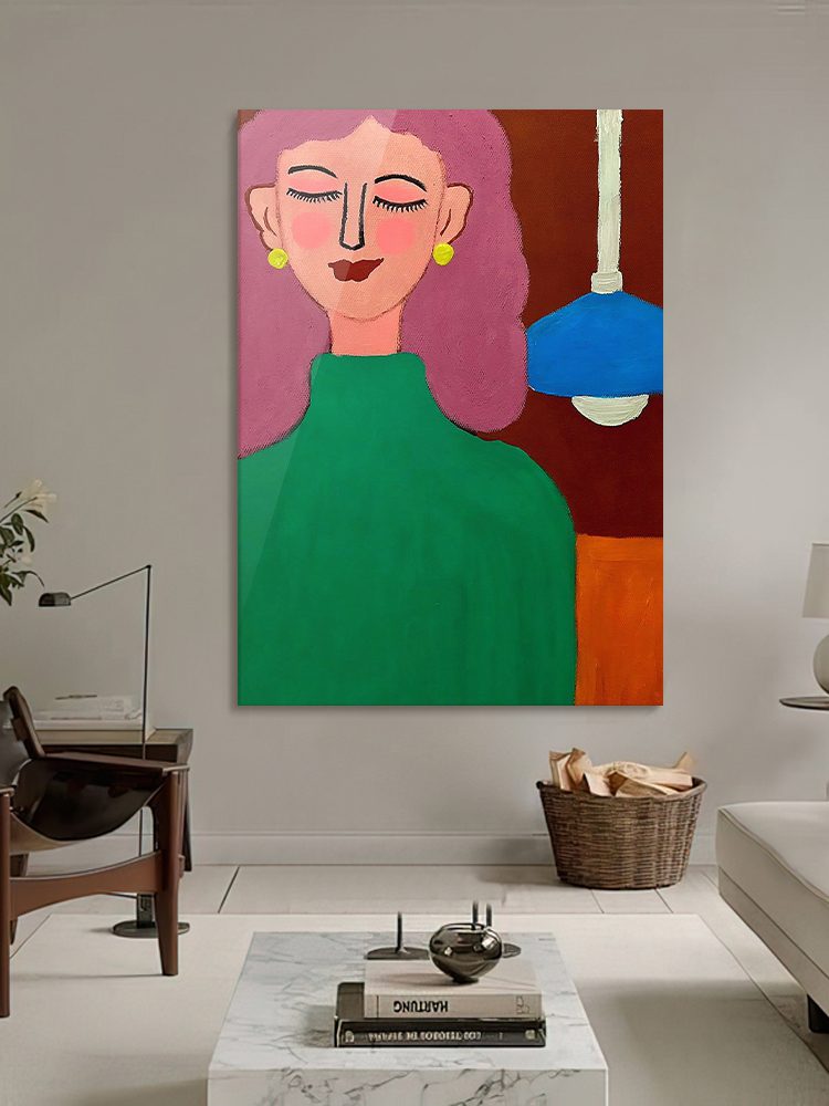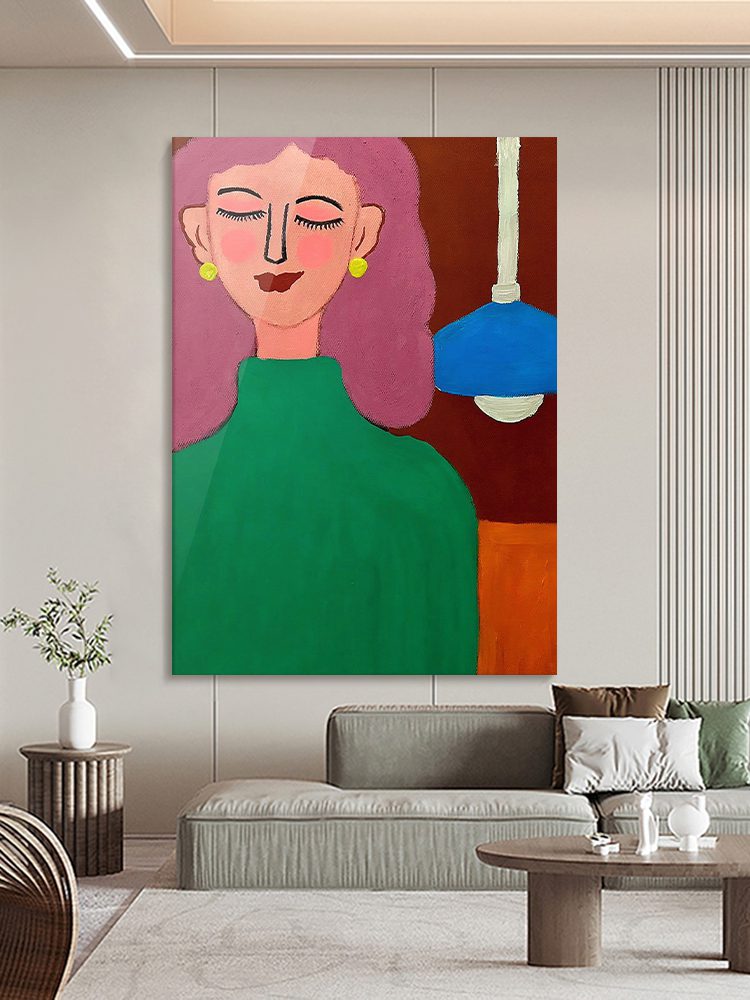 The painting depicts a portrait of a woman in meditation, filled with artistic charm. Her face is calm, exuding a sense of tranquility and peace. Her pink hair and green top are vividly colored and harmoniously paired, highlighting her individuality. The blue chandelier in the background adds a touch of modern flair to the scene. The overall style of the painting is simple yet lively, with bright colors that are pleasing to the eye. The figure in the painting seems to be immersed in her own world, serene and beautiful.