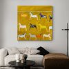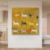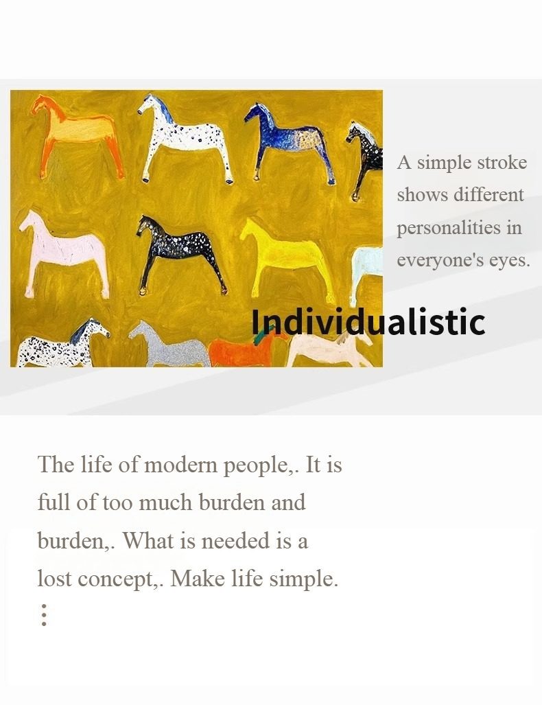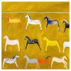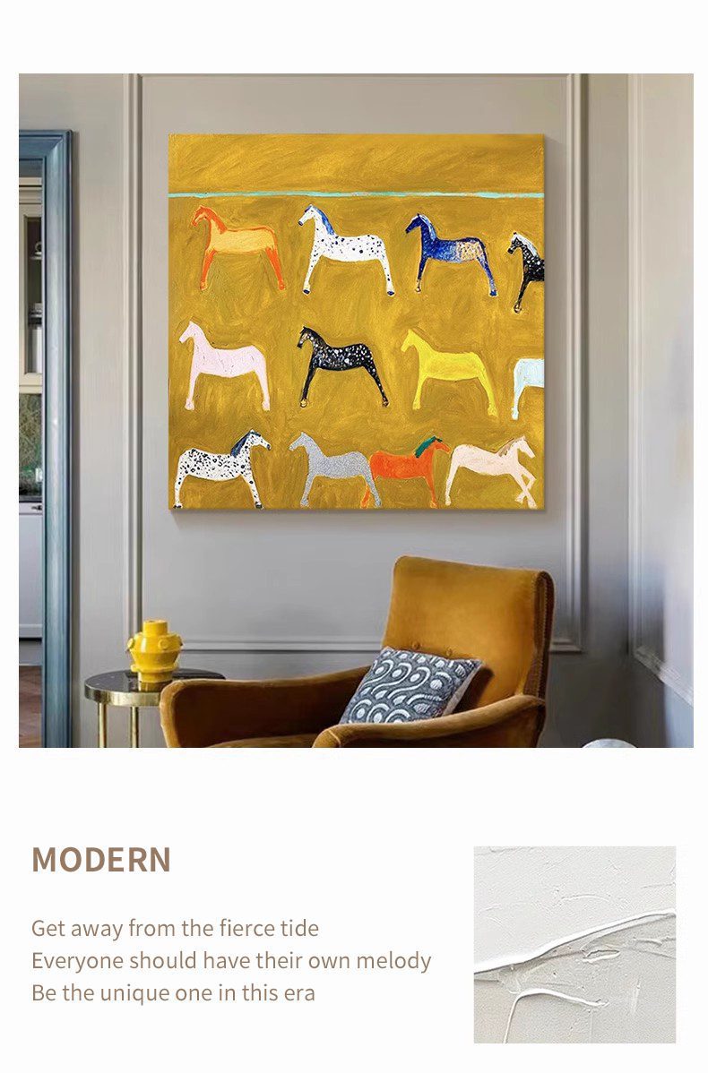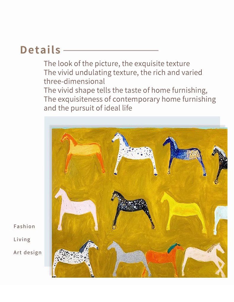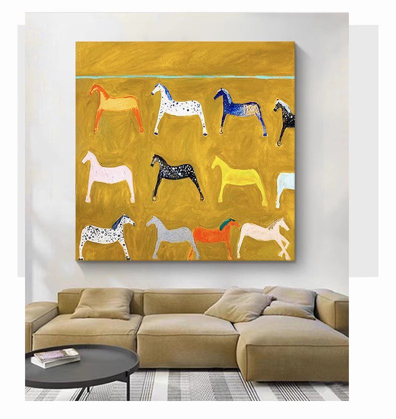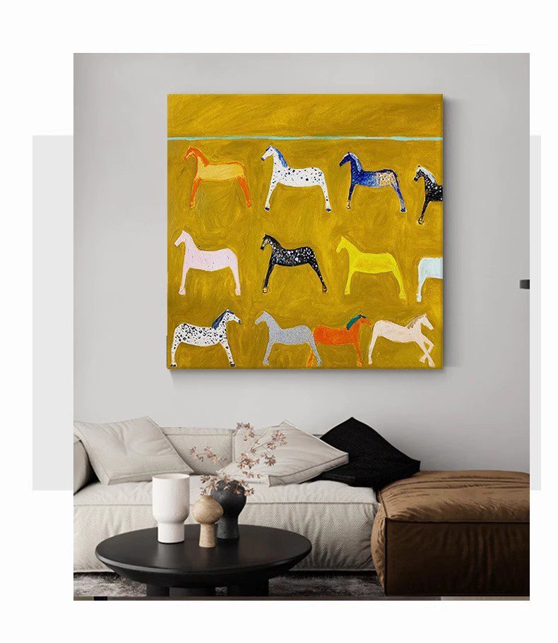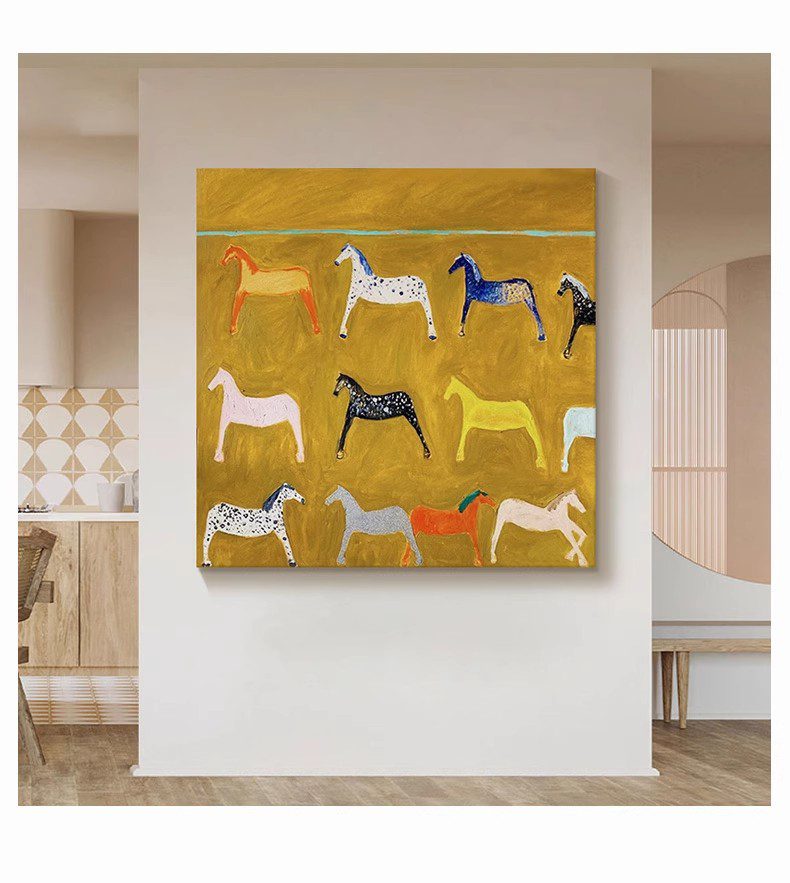 The painting features a vibrant herd of horses as its subject, with a warm yellow background that creates a bright and cozy atmosphere. In the artwork, each horse is depicted in different poses, either grazing with their heads down or neighing with their heads up. The simple yet fluid lines and striking contrast of colors showcase the horses’ agility and vitality.
