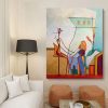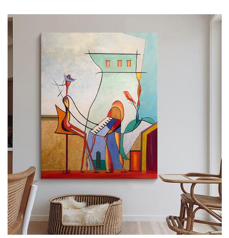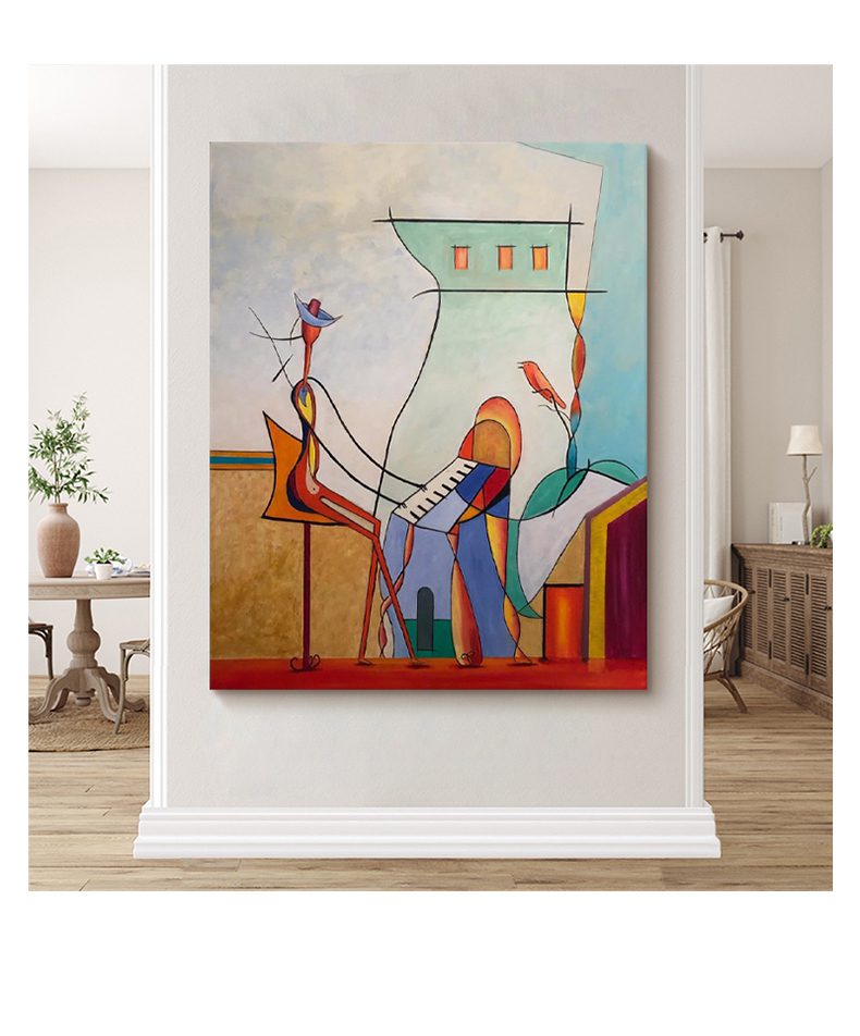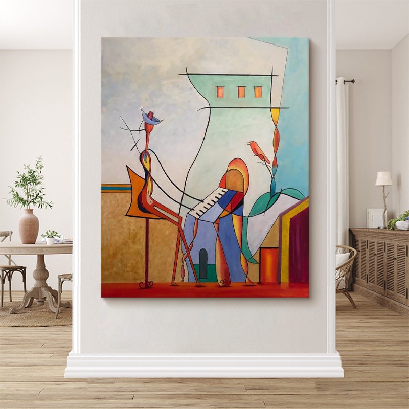 This painting combines abstract and realistic elements. In the center of the picture, a long-necked bird stands high up, with deep eyes, overlooking the area below. Below, a piano-like instrument is quietly placed, with distinct keys, as if silently telling a silent melody. In the background, the outline of the city is looming, adding a bit of fantasy and mystery. The whole painting is bright in color and smooth in lines, showing a dreamlike scene while revealing traces of reality, as if leading the viewer into a world full of infinite reverie, feeling the intertwined fantasy and reality, and listening to the silent movement.