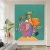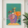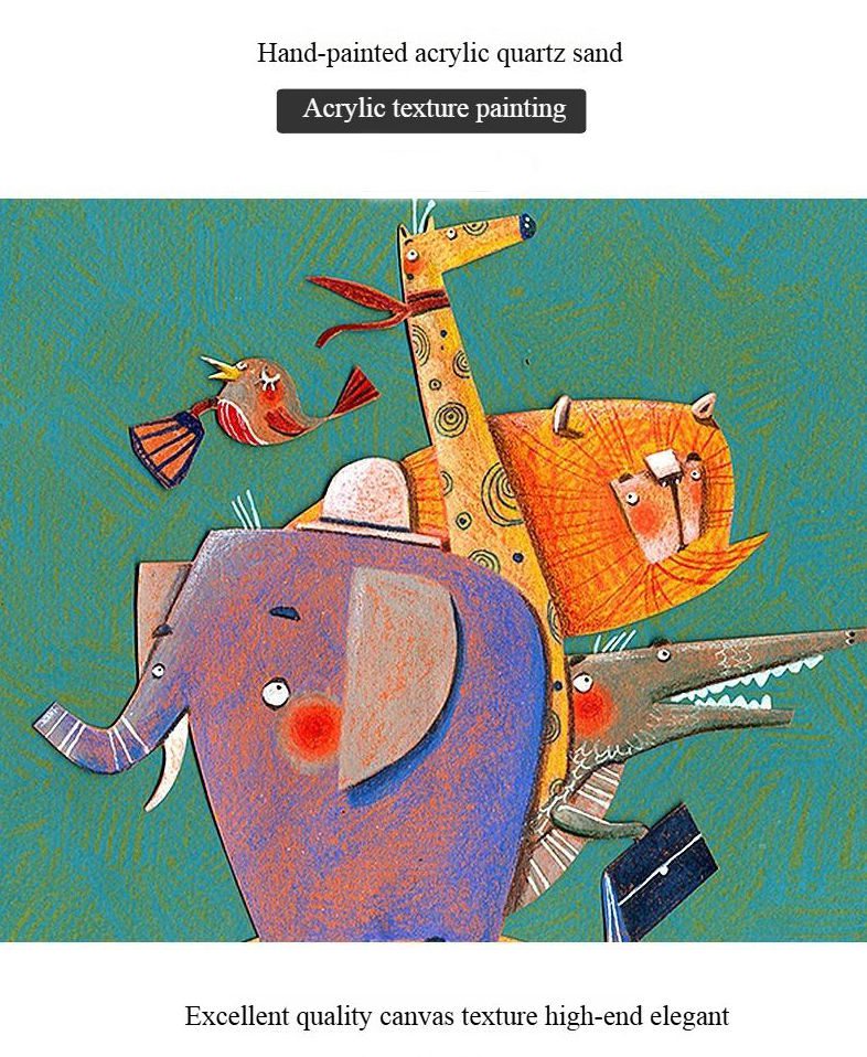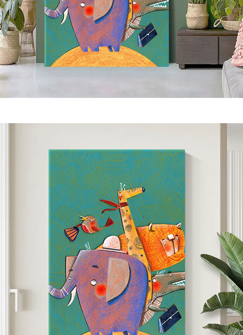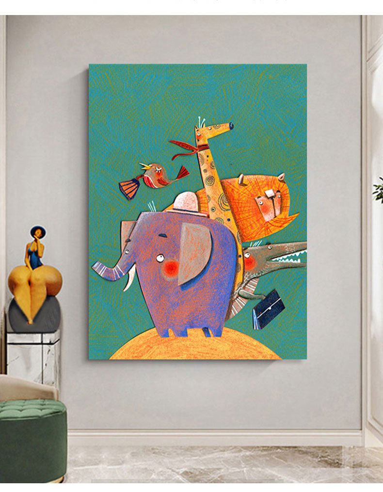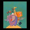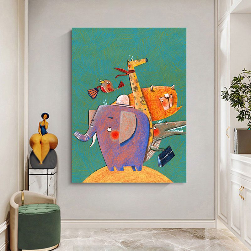 The painting depicts a warm and harmonious scene of animal joy. In the center of the picture, a purple elephant stands smiling, carrying an elegant giraffe on its back. The giraffe is adorned with patterns and has a red ribbon tied around its neck. Sitting atop the giraffe’s back is an orange hippo, also smiling. Above the elephant’s head, a red bird perches with feathers in its beak, seemingly singing joyfully. Additionally, hidden on the elephant’s back is a gray crocodile with its mouth open, holding a blue briefcase, adding a touch of fun to the scene. The entire painting is rich in color, and the animals interact amicably, creating an atmosphere filled with childlike innocence and happiness, which warms the heart.