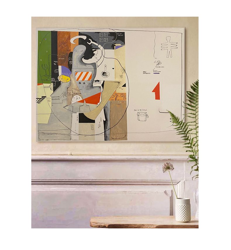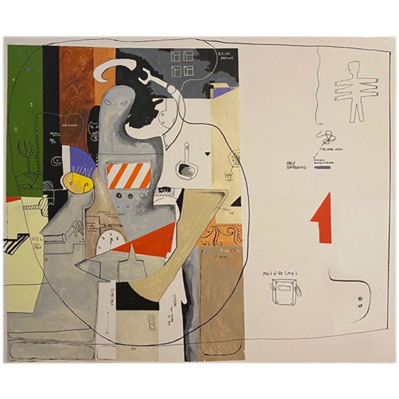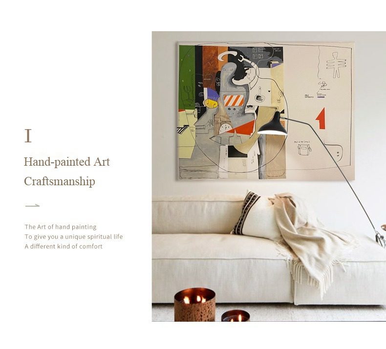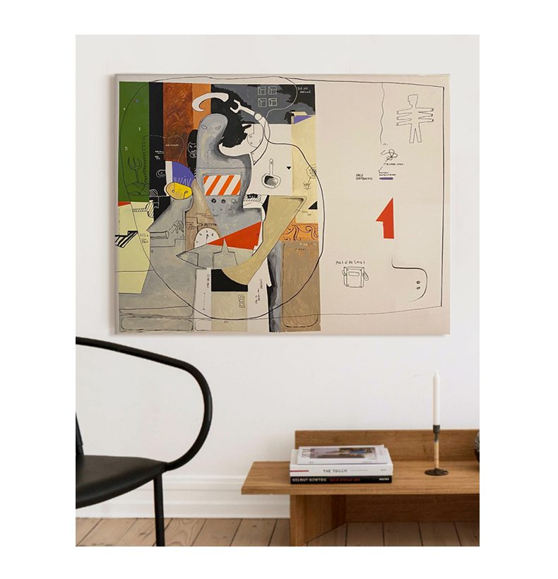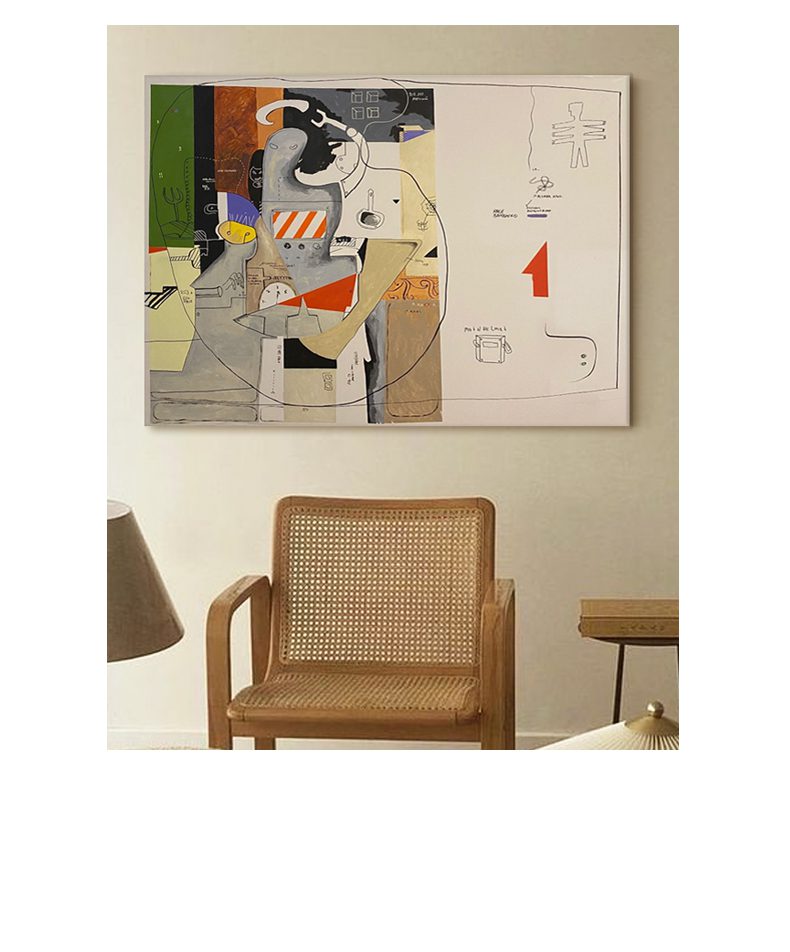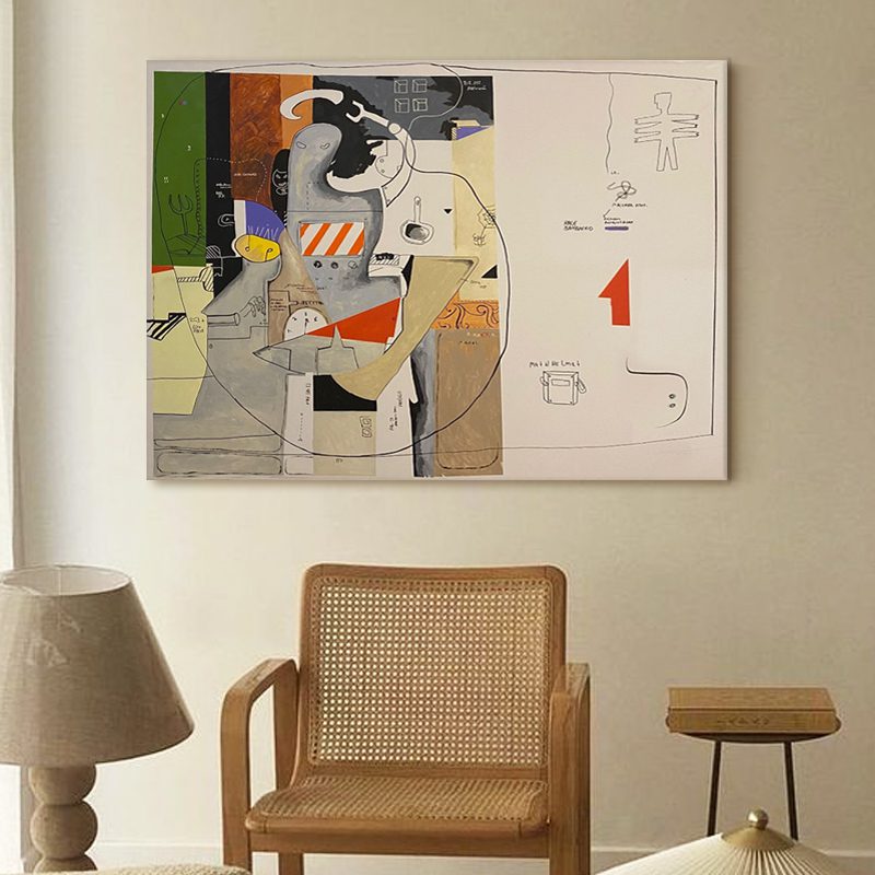 This painting is a masterpiece of abstract art, with the left side of the canvas being vibrant in color, featuring a mix of green, black, and orange that are interwoven and dynamic, as if telling an unknown story. The right side is dominated by beige and red, with simple lines creating a tranquil and peaceful atmosphere. The geometric shapes and lines within the painting are arranged in a harmonious way, forming a unique visual aesthetic.