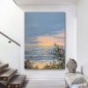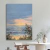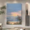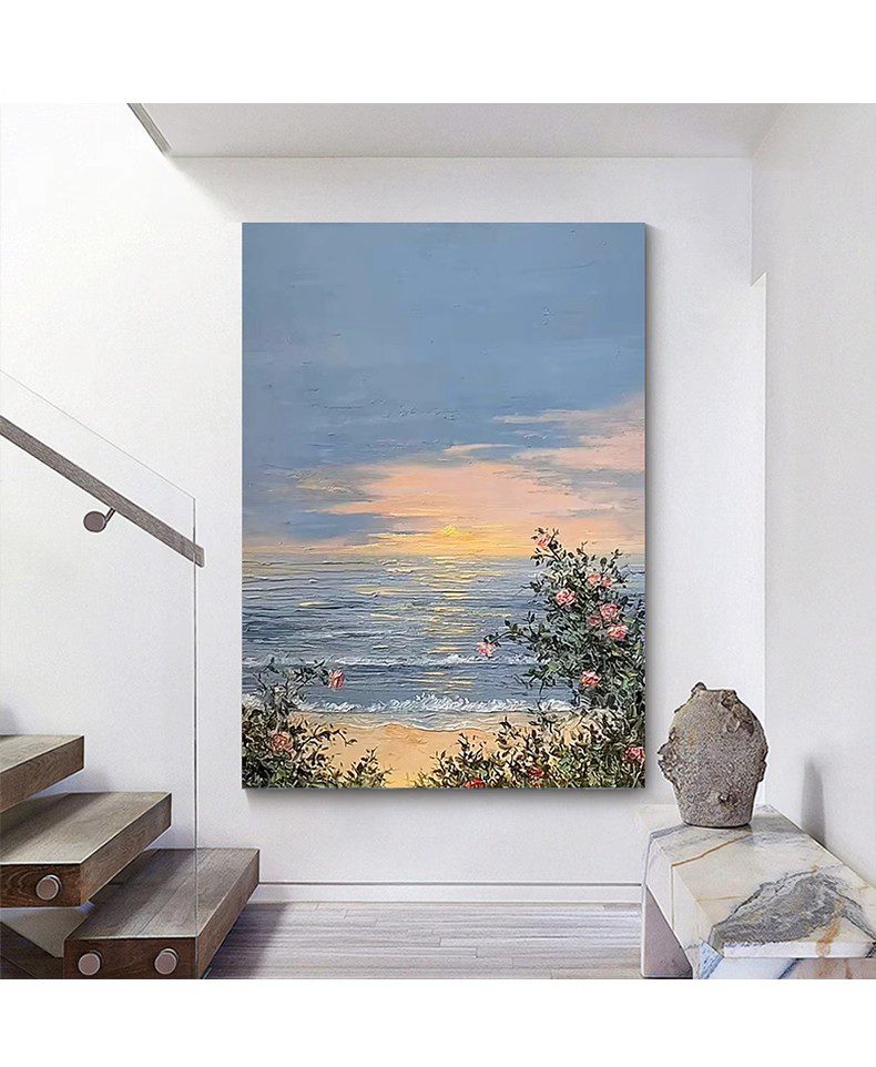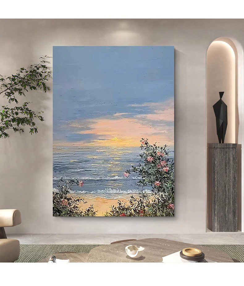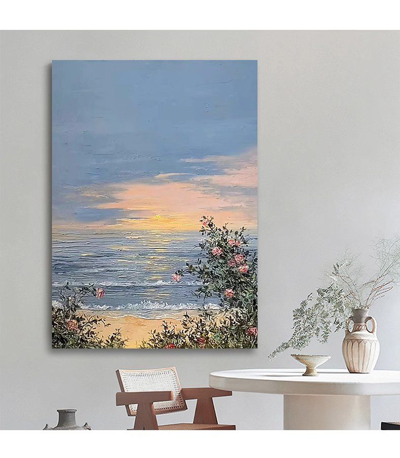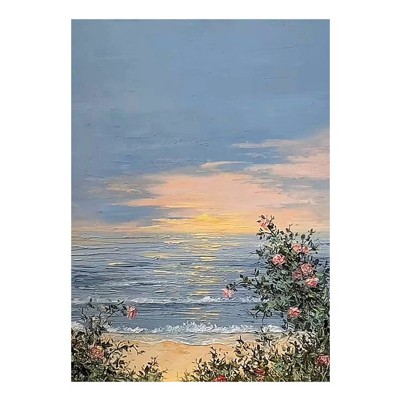 The painting depicts a serene coastal landscape. At the center of the canvas is a vast expanse of sea, where gentle waves softly lash against the sand. In the distance, the horizon blends into the sky, appearing particularly soft under the setting sun. On the right side, a cluster of blooming pink flowers contrasts with green leaves, adding vitality and color to the scene. In the sky, clouds interwoven in blue and orange presage the beauty of sunset, creating a tranquil and beautiful atmosphere. The delicate brushwork and rich colors make one feel as if they can sense the caress of the sea breeze and the warmth of the sunset, filling the entire painting with harmony and tranquility.