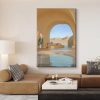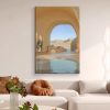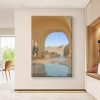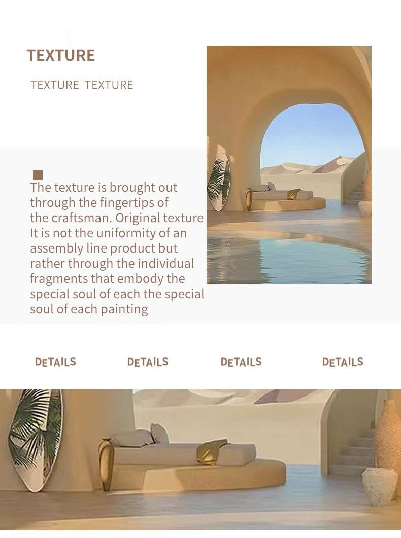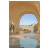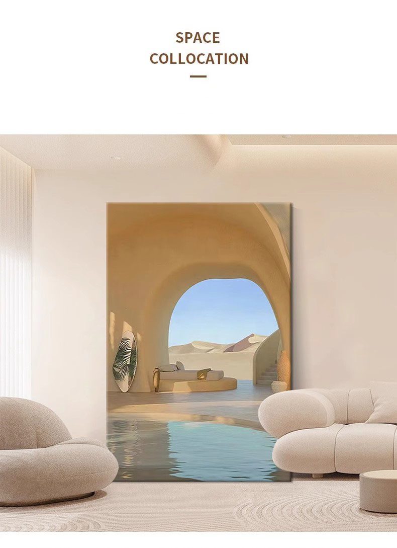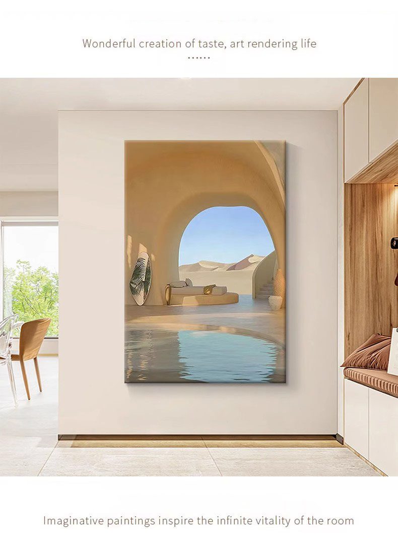 The painting depicts a serene and distant desert resort scene. In the center of the picture, an arched entrance leads viewers into a tranquil rest area, which is equipped with a clear swimming pool. The sunlight gently falls on the water surface, creating ripples that shimmer and radiate warmth. On both sides of the entrance, the sand-colored walls echo the distant dunes, forming a seamless whole.