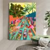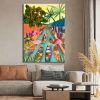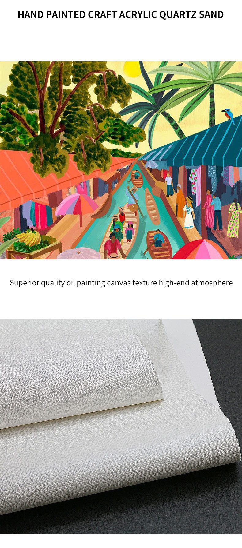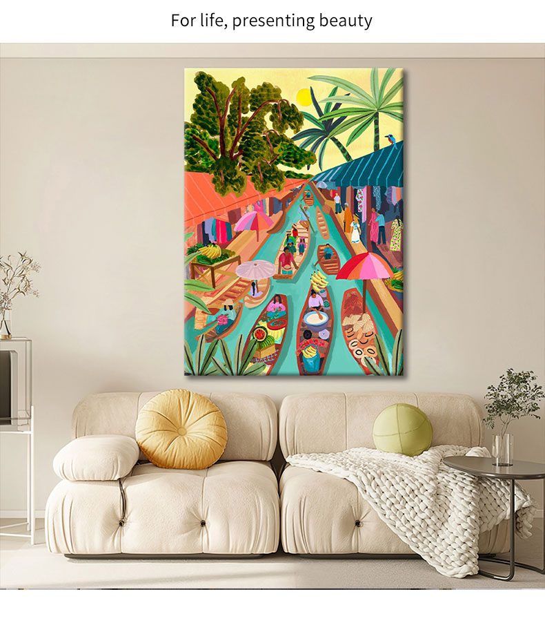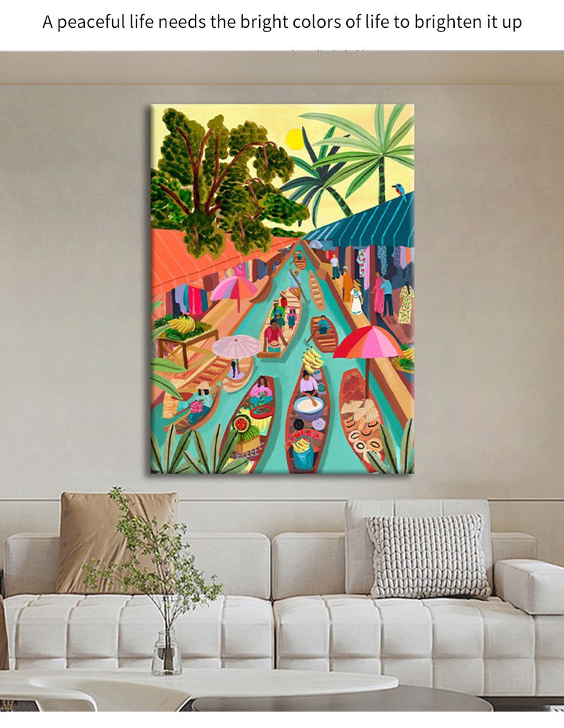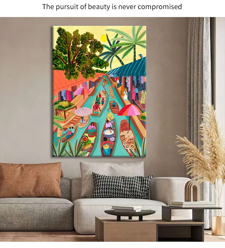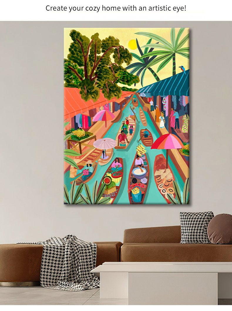 The painting depicts a bustling water market: colorful boats shuttle back and forth on the canal, laden with fresh fruits and vegetables that emit enticing aromas. Along the shore, various stalls are dazzlingly displayed, filled with goods attracting customers to stop and pick. People move through them, chatting or haggling, presenting a scene of busy harmony.